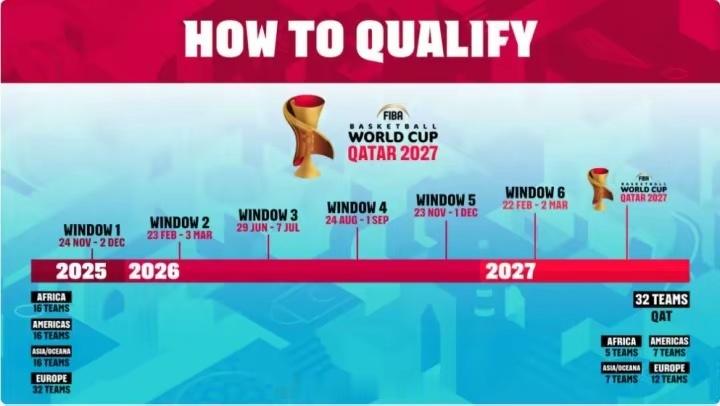不敌韩国遭遇2连败!男篮还有机会冲击2027年男篮世界杯吗?中国男篮晋级形势体育 12月1日讯 男篮世界杯亚洲区预选赛第一窗口期第一阶段,中国男篮76-90不敌韩国男篮遭遇2连败。本场比赛过后,中国队目前0胜2负积2分,暂列小组第三位。中国队晋级形势如何?听小编为你分析一下:2027年国际篮联篮球世界杯正赛拥有32个参赛名额。亚洲及大洋洲赛区拥有16支参赛队伍,产生8个晋级名额(东道主卡塔尔自动晋级)。参赛队伍包括:A组:新西兰、菲律宾、澳大利亚、关岛B组:中国、中国台北、韩国、日本C组:伊朗、伊拉克、约旦、叙利亚D组:卡塔尔(东道主)、印度、黎巴嫩、沙特阿拉伯除卡塔尔外的15支队伍将通过六个窗口期进行7个晋级名额的角逐。作为世界杯东道主,卡塔尔队已自动获得晋级名额。但卡塔尔队仍将参加亚洲区预选赛的比赛。第一轮在前三个窗口期(2025年11月、2026年2月、2026年7月)中,各队将与同组其余三队进行主客场双循环较量,每个窗口期每队进行两场比赛。各组前三名将晋级预选赛第二轮,并与另一小组的三支队伍合并成新小组。(A组与C组合并成为E组,B组与D组合并成为F组)已提前锁定晋级资格的东道主卡塔尔队将占据所在小组的三个晋级名额之一,无论其在小组赛中的排名如何。所有队伍在第一轮的战绩将带入第二轮。第二轮晋级队伍将在2026年8月、2026年11月及2027年2月的三个窗口期中,与合并小组中来自另一小组的三支队伍进行主客场双循环交锋,每个窗口期每队进行两场比赛。在完成第二轮额外六场比赛后,除卡塔尔外,每个小组的前三名及成绩最好的第四名队伍将获得2027年国际篮联篮球世界杯参赛资格。📅 窗口期时间安排第一窗口期:2025年11月24日-12月2日第二窗口期:2026年2月23日-3月3日第三窗口期:2026年6月29日-7月7日第四窗口期:2026年8月24日-9月1日第五窗口期:2026年11月23日-12月1日第六窗口期:2027年2月22日-3月2日中国队接下来在第二窗口期将连续客战日本(2026.2.26)和中国台北(2026.3.1)。希望中国队再接下来五个窗口期的比赛中赛出风格,赛出特色,拿出精气神,打出自己的风格,争取世界杯的出线名额!