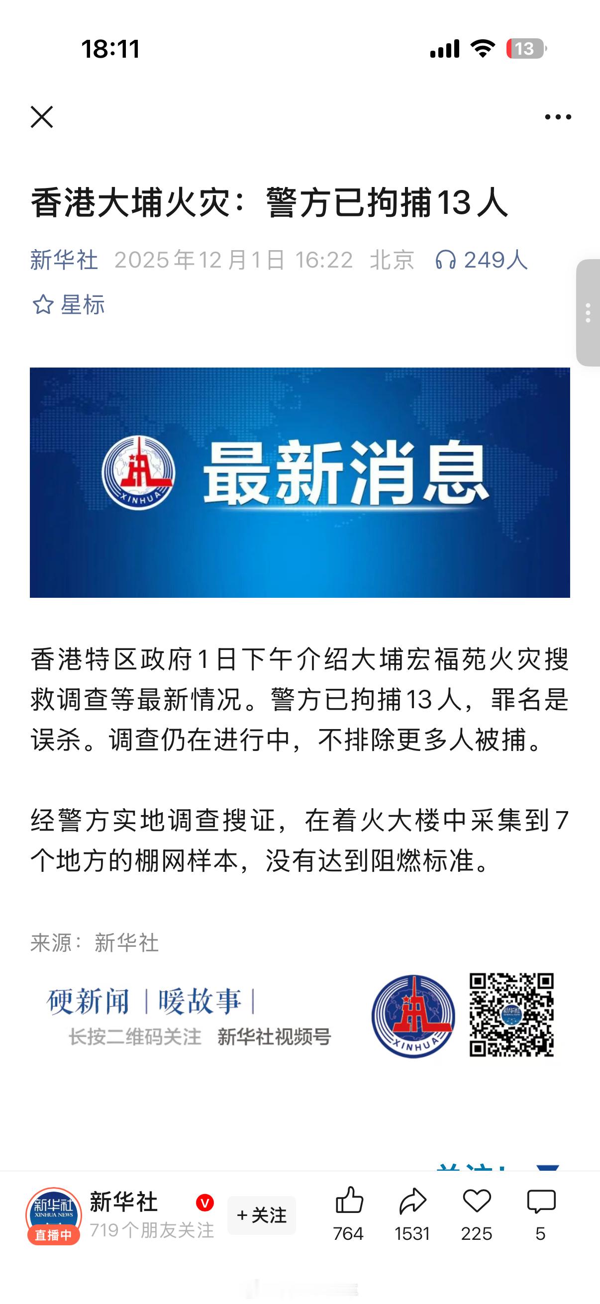 香港火灾已致151人遇难现在抓的人已经13人了,罪名是误杀!!!这还没完,不排除更多人会被捕!因为棚网就就没有达到阻燃标准!这就是人祸!这么多人遇难真是悲痛!另外还有30人失联,哎…. 上海