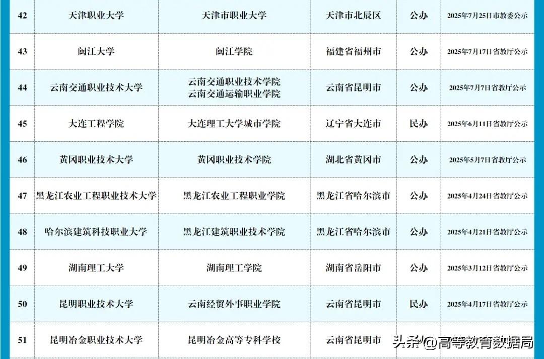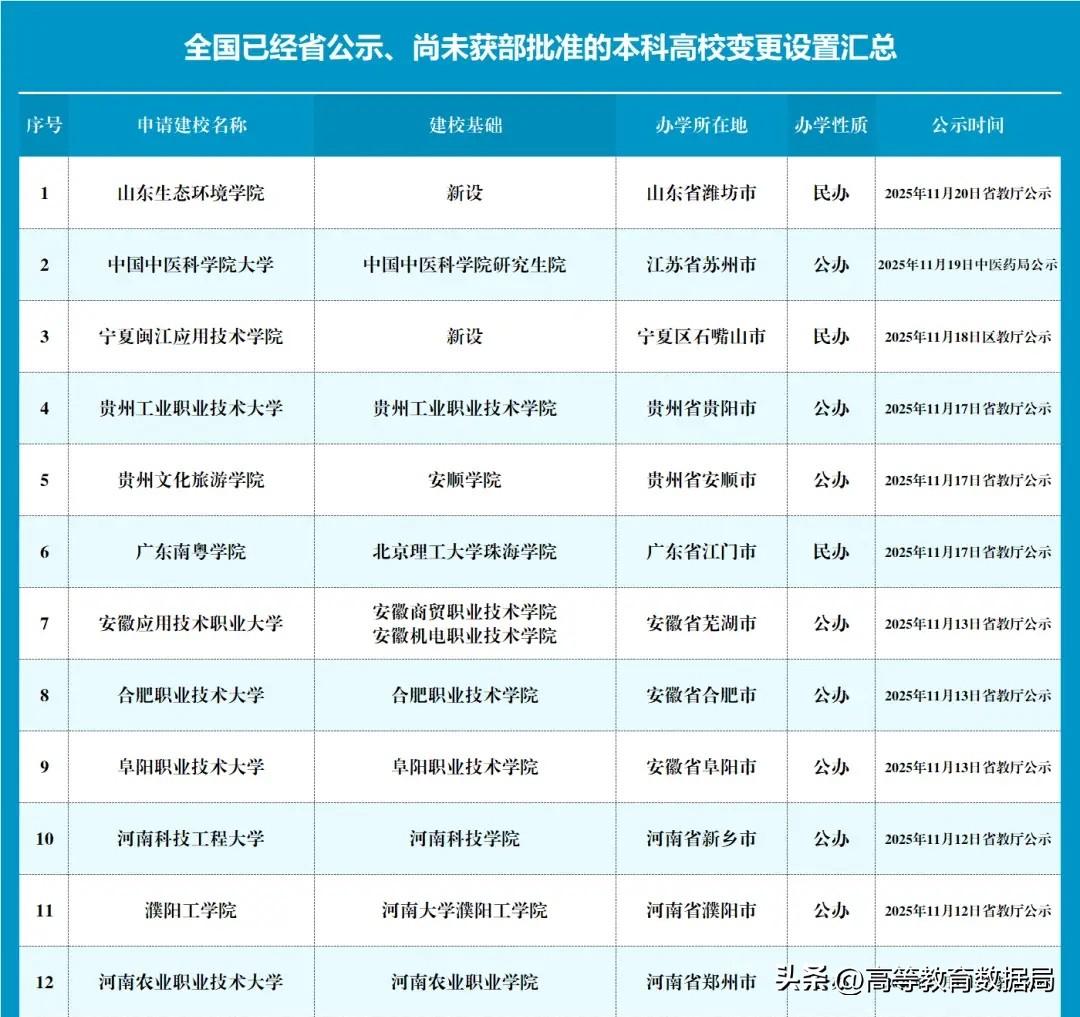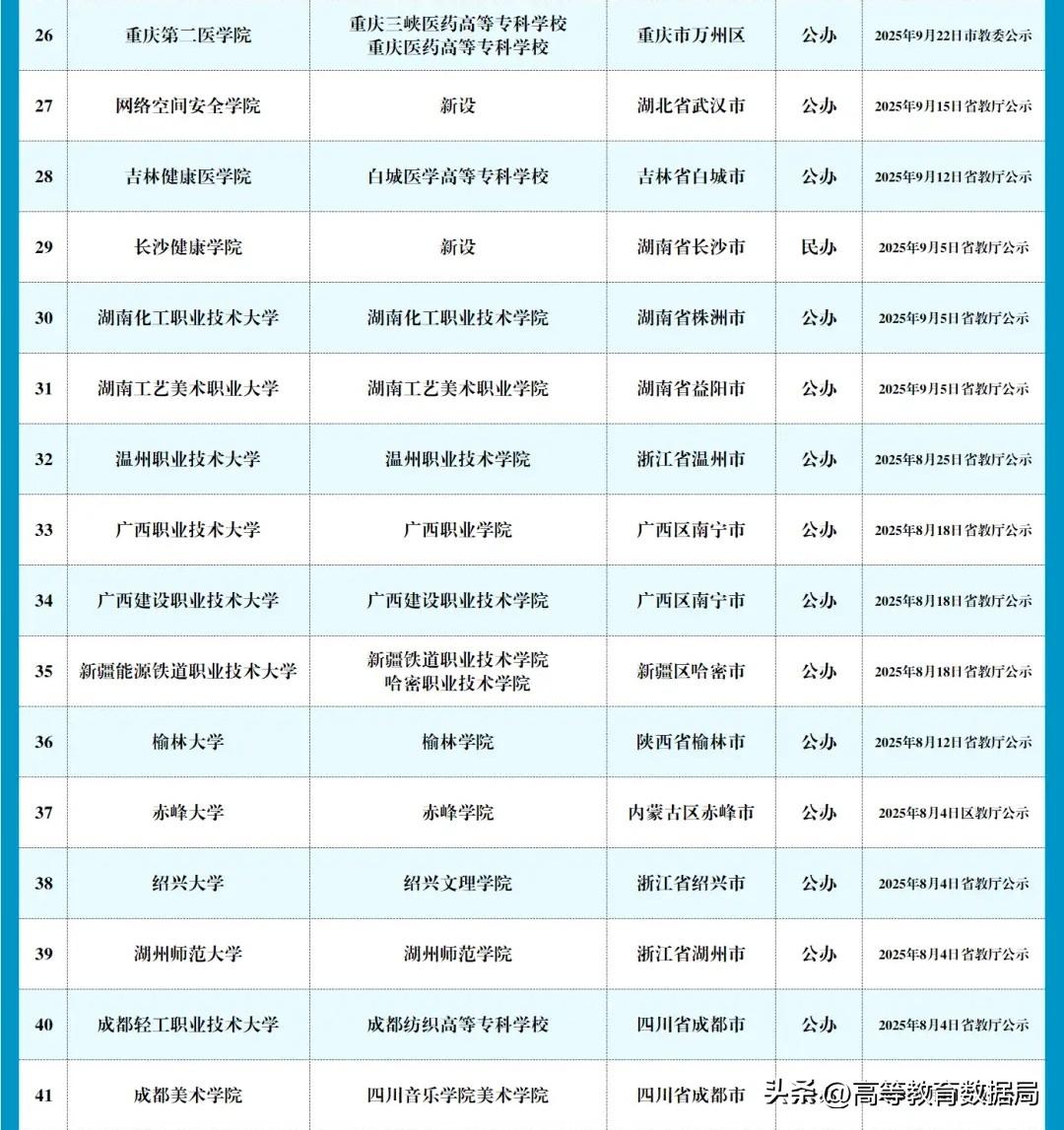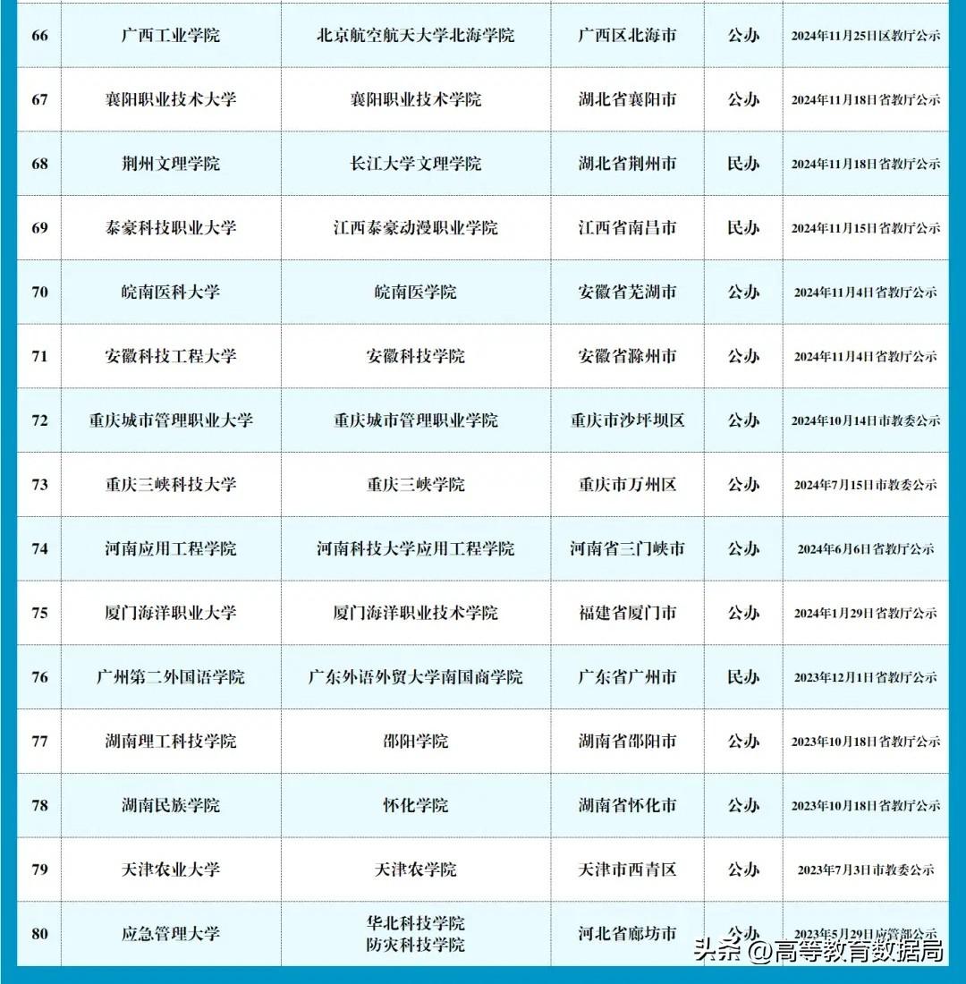 当前全国各省份共公示了80所本科院校的设置事项属于还没有获得教育部批复的,其中2025年以来共公示了51所,2025年之前共公示了29所。关于北京航空航天大学北海学院的转设公示已经是第3次了,至今还未转设成功。 大学 高校设置
