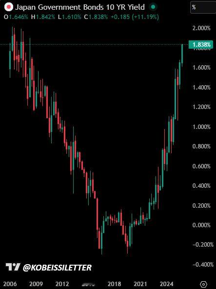 其实,如果说高市早苗的外交政策是自爆。。。那么她的经济政策。。。是更大的自爆。。。图表显示了2006-2024年的JGB(日本政府债券) 10年期收益率走势:从金融危机后的低谷(接近0%),到2024年突然拉升到1.8%以上,这是17年来的高点(截至2025年12月1日,已达1.88%)。这不是小波动,而是“历史性”的,因为日本长期依赖超低利率(甚至负利率),现在收益率像火箭一样窜上去,市场都慌了。市场心态:“财政炸弹要爆了,赶紧跑路”的恐慌心态。投资者像看到火山喷发一样,对日本政府的“花钱如流水”政策超级担心,觉得债务会失控,导致通胀失控或BOJ(日本央行)被迫猛加息。日本老百姓的生活成本会因为通胀上升。财政赤字加剧。企业借贷成本上升,利润被压缩。而在核心竞争力不明确的领域内的大规模投资,回报可疑。我甚至怀疑,她打算通过对中国强硬巩固支持率,来对冲通货膨胀而掉下去的支持率。。。今天似乎全世界,都进入了某种既草台,又混乱,又危险的状态。。。