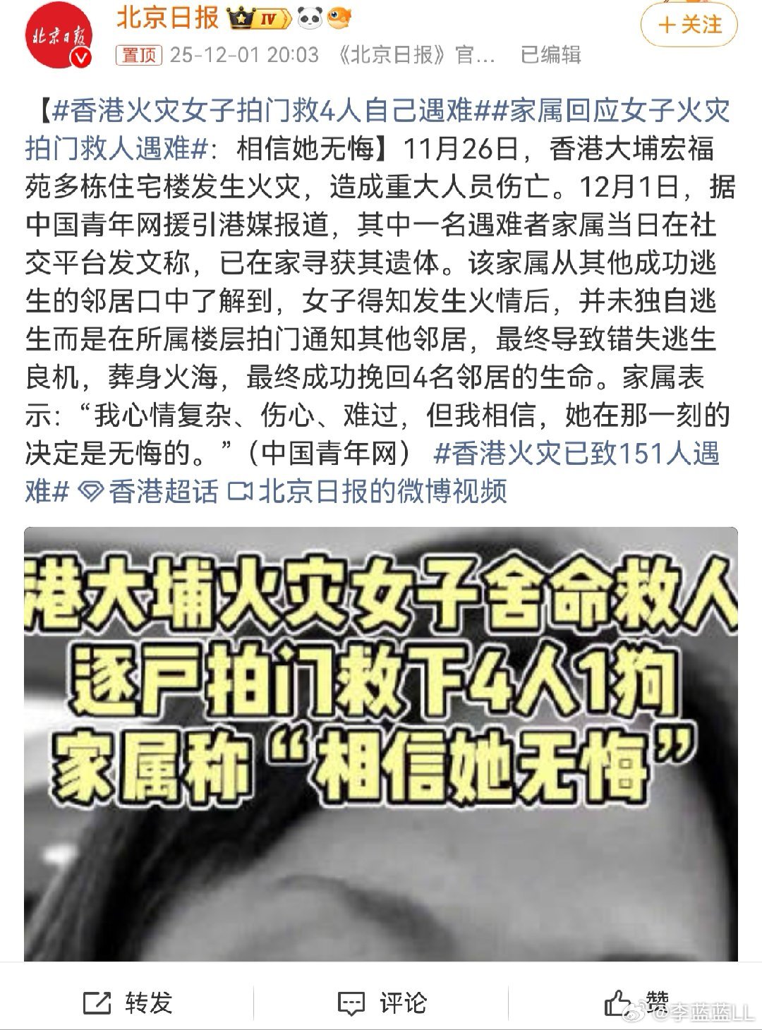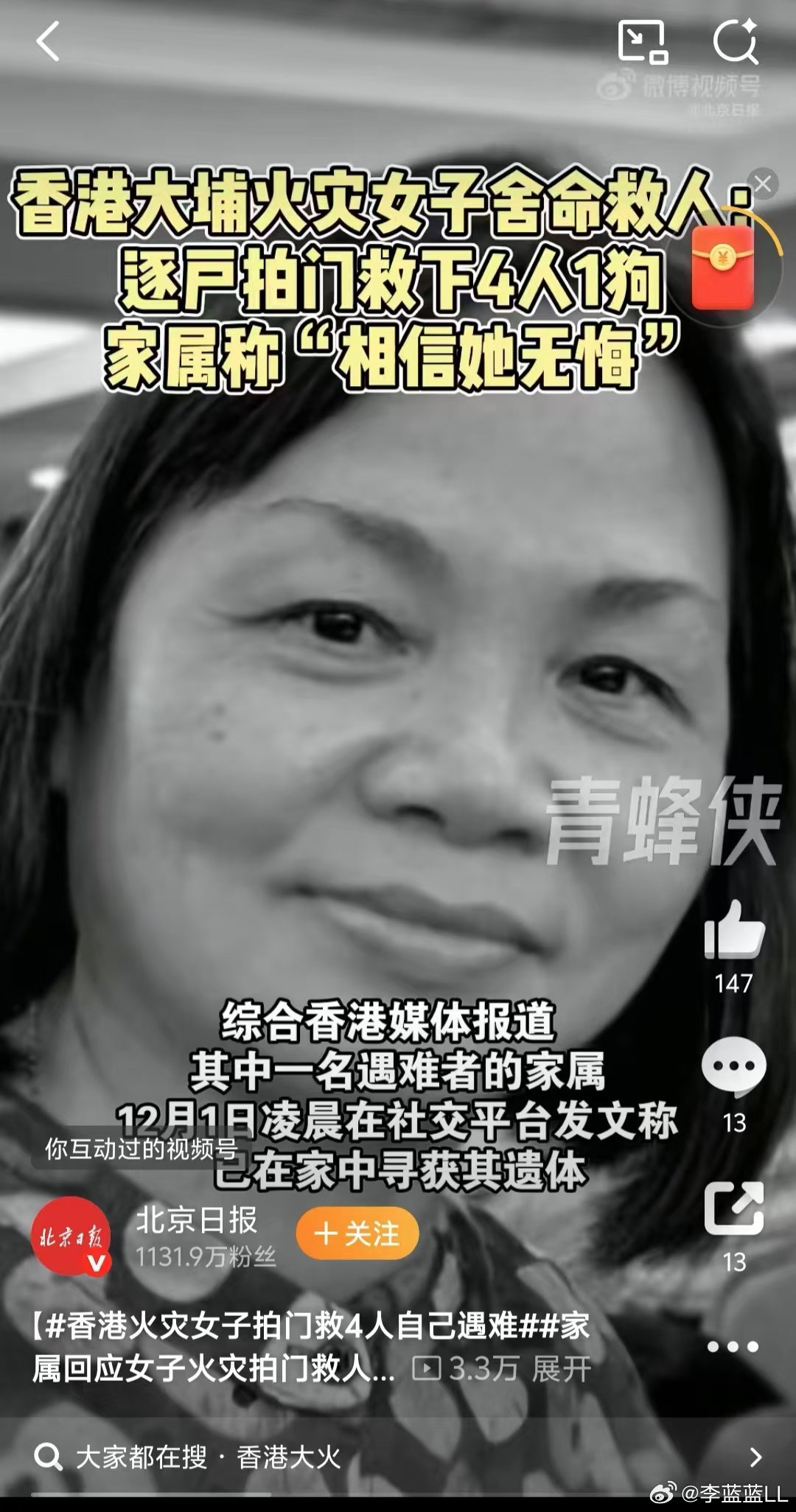 香港火灾女子拍门救4人自己遇难 看得好难受啊!为什么连她的名字都不公布?用自己一条命换了4人1狗,她是真正的凡人英雄,名字和善举值得被永远铭记,应该广泛传颂才是啊!同时也希望能给英雄她家人更多兜底的补贴和温暖,让英雄走得安心。