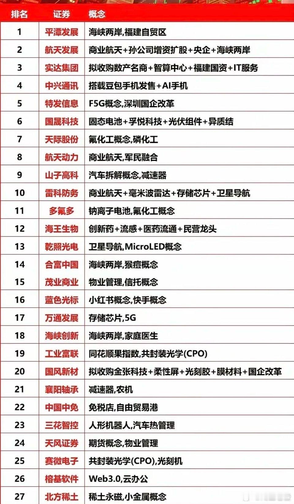 28只人气个股热点主线梳理:聚焦“政策+科技”双主线28只人气个股的热点主线集中于三大方向:一是政策关联标的,如平潭发展、海峡创新等;二是科技赛道个股,像航天发展、中兴通讯等;三是细分产业龙头。高人气个股多具备多概念叠加属性,精准契合当前市场“政策+科技”的炒作偏好。个股深度解析1. 平潭发展:聚焦海峡两岸、福建自贸区概念,作为区域政策直接受益标的,依托福建自贸区位优势及海峡两岸合作红利,政策协同预期使其成为区域经济炒作主线的核心标的之一。2. 航天发展:叠加商业航天、子公司增资、央企、海峡两岸多重概念,商业航天作为科技热点赛道,叠加央企属性与海峡政策利好,多逻辑共振推高其市场人气。3. 实达集团:拟收购数产名商并布局智算中心,叠加福建国资、IT服务标签,智算中心业务契合当前AI算力赛道热度,收购动作与国资背景进一步提升市场关注度。4. 中兴通讯:因搭载豆包手机、AI手机概念上榜,此前豆包手机助手预览版引发市场热议,公司作为硬件合作方,AI终端创新预期持续推升其人气。5. 特发信息:涵盖F5G、深圳国企改革概念,F5G作为通信技术升级核心主线,叠加深圳国企改革政策催化,双逻辑支撑使其成为市场人气标的。6. 国晟科技:聚焦固态电池、光伏组件等领域,固态电池是新能源电池升级核心赛道,光伏组件契合绿电发展主线,叠加异质结技术优势,属于新能源细分领域热点标的。7. 天际股份:涉及氟化工、磷化工概念,氟化工是锂电材料上游核心环节,磷化工兼具周期属性与新能源属性,行业供需改善预期使其成为周期+新能源交叉赛道标的。8. 航天动力:覆盖商业航天、军民融合概念,商业航天近期市场热度较高,军民融合政策导向进一步强化其在航天主线中的人气地位。9. 山子高科:主打汽车拆解、减速器概念,汽车拆解契合循环经济政策导向,减速器是机器人与新能源汽车核心部件,双细分赛道叠加推高市场关注。10. 雷科防务:叠加商业航天、毫米波雷达、存储芯片等多重概念,商业航天+存储芯片均属科技热点领域,毫米波雷达契合智能驾驶发展趋势,多科技逻辑共振提升人气。11. 多氟多:涉及钠离子电池、氟化工概念,钠离子电池是新能源电池重要发展路线之一,氟化工是锂电上游核心材料,契合新能源细分赛道热度。12. 海王生物:覆盖创新药、流感、医药流通等业务,创新药是医药板块核心主线,流感需求预期叠加民营龙头属性,使其成为医药赛道人气标的。13. 乾照光电:主打卫星导航、MicroLED概念,卫星导航契合航天军工发展主线,MicroLED是显示技术升级重要方向,属于科技细分领域热点标的。14. 合富中国:涵盖海峡两岸、猴痘概念,海峡政策是区域经济核心主线,猴痘相关医药需求预期提升,双概念叠加使其跻身人气榜。15. 茂业商业:涉及物业管理、信托概念,属于传统消费服务与金融配套赛道,业务稳健性持续吸引部分市场资金关注。16. 蓝色光标:覆盖小红书、快手概念,隶属营销传媒赛道,依托平台流量优势,契合新媒体营销领域的市场关注方向。17. 万通发展:涉及存储芯片、5G概念,存储芯片是半导体板块核心主线,5G是通信基础设施核心赛道,科技硬件细分领域热度推升其人气。18. 海峡创新:涵盖海峡两岸、家庭医生概念,海峡政策是区域经济核心主线,家庭医生契合医疗服务升级趋势,双概念叠加推高市场关注度。19. 工业富联:涉及CPO概念,CPO是光通信技术升级核心方向,契合AI算力传输需求,属于科技硬件赛道核心标的。20. 国风新材:拟收购金张科技,布局柔性屏、光刻胶等领域,收购动作带来资产整合预期,柔性屏、光刻胶均为半导体及显示领域热点方向。21. 襄阳轴承:涉及减速器、农机概念,减速器是机器人与新能源汽车核心部件,农机业务契合乡村振兴政策导向,双逻辑支撑其市场人气。22. 中国中免:主打免税店、自贸港概念,隶属消费赛道,依托免税政策红利与自贸港发展机遇,是消费复苏主线核心标的之一。23. 三花智控:覆盖人形机器人、汽车热管理概念,汽车热管理是新能源汽车核心赛道,人形机器人属科技主线热点,双热点叠加推高市场关注。24. 天风证券:涉及期货、物业管理概念,隶属金融及消费服务赛道,期货业务契合资本市场活跃度提升预期,同时布局传统服务领域。25. 赛微电子:涵盖CPO、光刻机概念,CPO是光通信领域热点方向,光刻机是半导体高端制造核心设备,硬科技属性持续推升其人气。26. 榕基软件:涉及Web3.0、云办公概念,Web3.0是互联网技术升级方向,云办公契合数字化发展主线,属于科技应用赛道热点标的。27. 北方稀土:涉及稀土永磁、小金属概念,稀土永磁是新能源、风电领域核心材料,小金属的资源属性及供需改善预期推升其市场关注度。28. 海南瑞泽:涵盖海南自贸区、自贸港概念,作为区域政策受益标的,依托海南自贸港发展红利,是区域经济主线人气标的。总结本次人气榜清晰体现了当前市场对“政策+科技”主线的偏好:政策端聚焦海峡两岸、自贸区等区域发展及制度改革红利;科技端围绕商业航天、AI终端等前沿赛道展开;同时叠加医药、消费等细分产业的需求预期。多概念叠加的个股更易获得市场高人气,后续市场关注或持续向政策催化明确、科技赛道景气度高的标的集中。