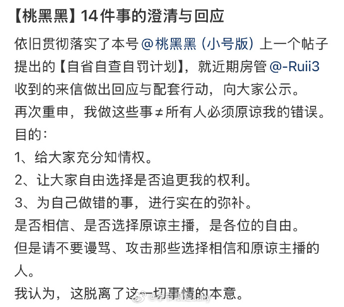 桃黑黑发了“14件事的澄清与回应”,人红是非多,做不到完美和让所有人都喜欢和满意的