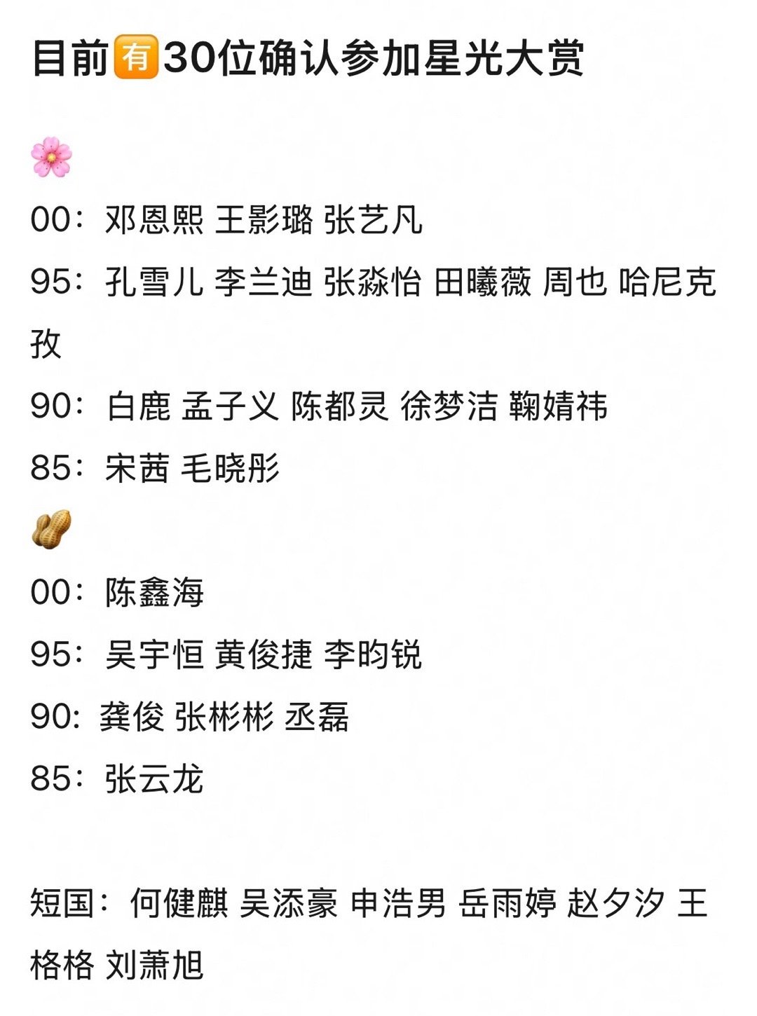 目前确定出席星光大赏的明星们,,目前全是小花小生