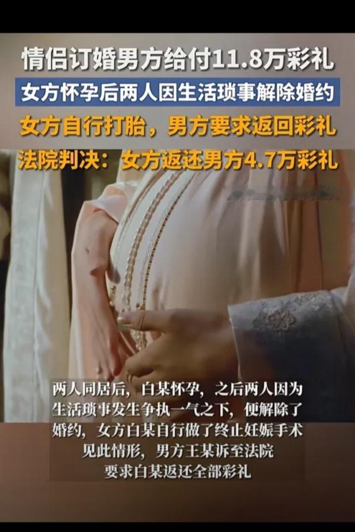 江苏无锡一对情侣订婚后同居,女生怀孕后,因生活琐事和男生发生争执,一气之下,双方解除了婚约,女生瞒着对方,自行做了终止妊娠手术,男方非常愤怒,一纸诉状将女方诉至法院,要求返还全部彩礼。法院判了! 小王和小白订婚,小王家给了女方11.8万彩礼,还拉着小白去金店挑了项链和镯子 --这三金是小王主动买的,说是订婚礼。两家摆了十几桌订婚酒,请了亲戚街坊,小白当天就搬去小王的婚房住了,就等着年底扯证办婚礼了。 住了还不到三个月,小白查出来怀了孕,本来是皆大欢喜的事,结果,2人却因琐事发生争执,吵到后来,连“工资谁管”“碗谁洗”这种鸡毛蒜皮的事都能翻脸。小白气上头喊“这婚没法结了”,小王也是个倔脾气,接了句“散就散”,俩人当场就拍板退婚了。 小白搬回娘家后,自己去医院做了手术,没跟小王打声招呼。小王知道后火更大了,拍着桌子要彩礼:“没扯证就不算夫妻,这11.8万是奔着结婚给的,现在不结了,必须全退!”小白也不服气:“我跟你住了三个月,怀了你的孩子又打胎,身体遭多大罪?凭啥全额退?”协商来协商去没结果,小王直接把小白告到了法院。 法院审理认为,双方未办结婚登记但已共同生活,且女方有妊娠经历,仅因未登记要求全额返还彩礼有违公平原则。法院综合考虑共同生活、孕育情况及当地习俗,判决白某返还王某47000余元。有网友说:“11.8万买不来人家怀一次孕又打胎的罪!法院判得公道,没让姑娘白受委屈!”“男方只盯着自己的钱,压根没提姑娘的身体损伤,这算盘打得,隔三条街都能听见响!” 订了婚摆了酒,俩人都同居备孕了,这跟实打实的夫妻日子也没差啥了。闹矛盾退婚谁都有脾气,但姑娘怀了孩子又遭了打胎的罪,这身体和心理的伤害可不是闹着玩的。彩礼是给结婚准备的,现在婚黄了,男方想要回部分合理,但想一口吞回全部也太不讲情面了。 毕竟姑娘不是白白跟他住了三个月,还为他怀了孕,遭的罪没法用钱衡量。法院判返还四万多,既没让男方亏到底,也没让姑娘白受委屈,这公平秤端得挺正。婚姻不是儿戏,彩礼也不是买卖,遇事多替对方想想,也不至于闹到法庭上撕破脸。各位读者你们怎么看?欢迎在评论区讨论。