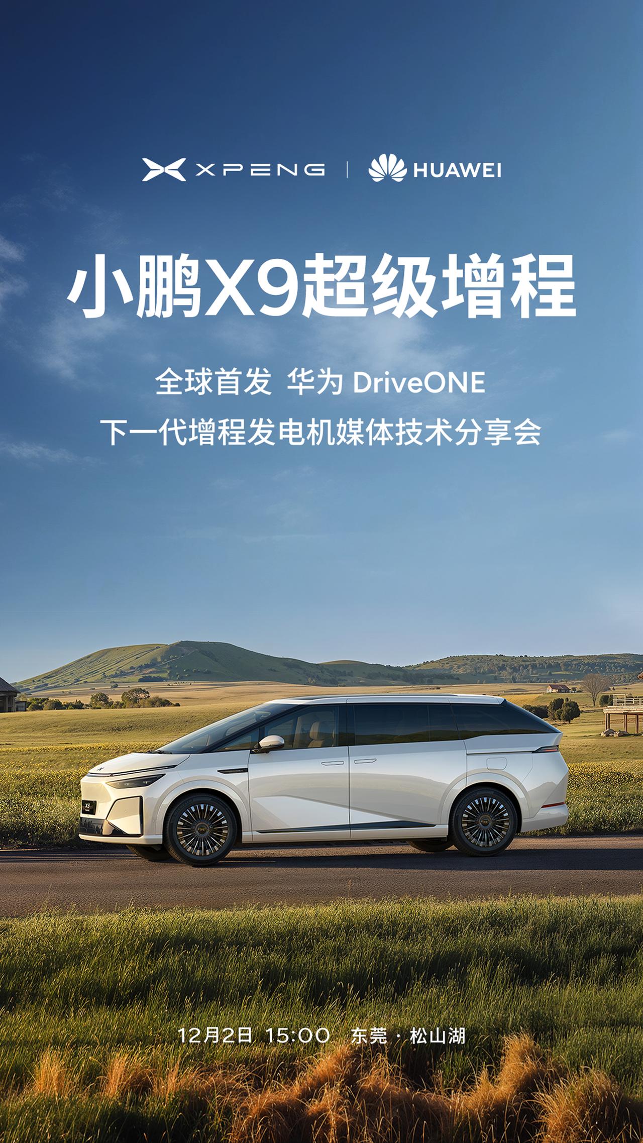 小鹏和华为联手!小鹏X9超级增程全球首发华为DriveONE下一代增程发电机。 12月2日下午15点,小鹏和华为将在华为总部-东莞松山湖举办下一代增程发电机媒体技术分享会。针对这一增程发电机,小鹏和华为团队究竟如何打造行业功率密度最高增程发电机?背后又有哪些故事?让我们拭目以待。 正是这些技术硬实力,让小鹏X9的11月交付量环比劲增161%,小鹏X9超级增程全系车型交付周期均已延至6-8周,成为备受欢迎的家用大七座。