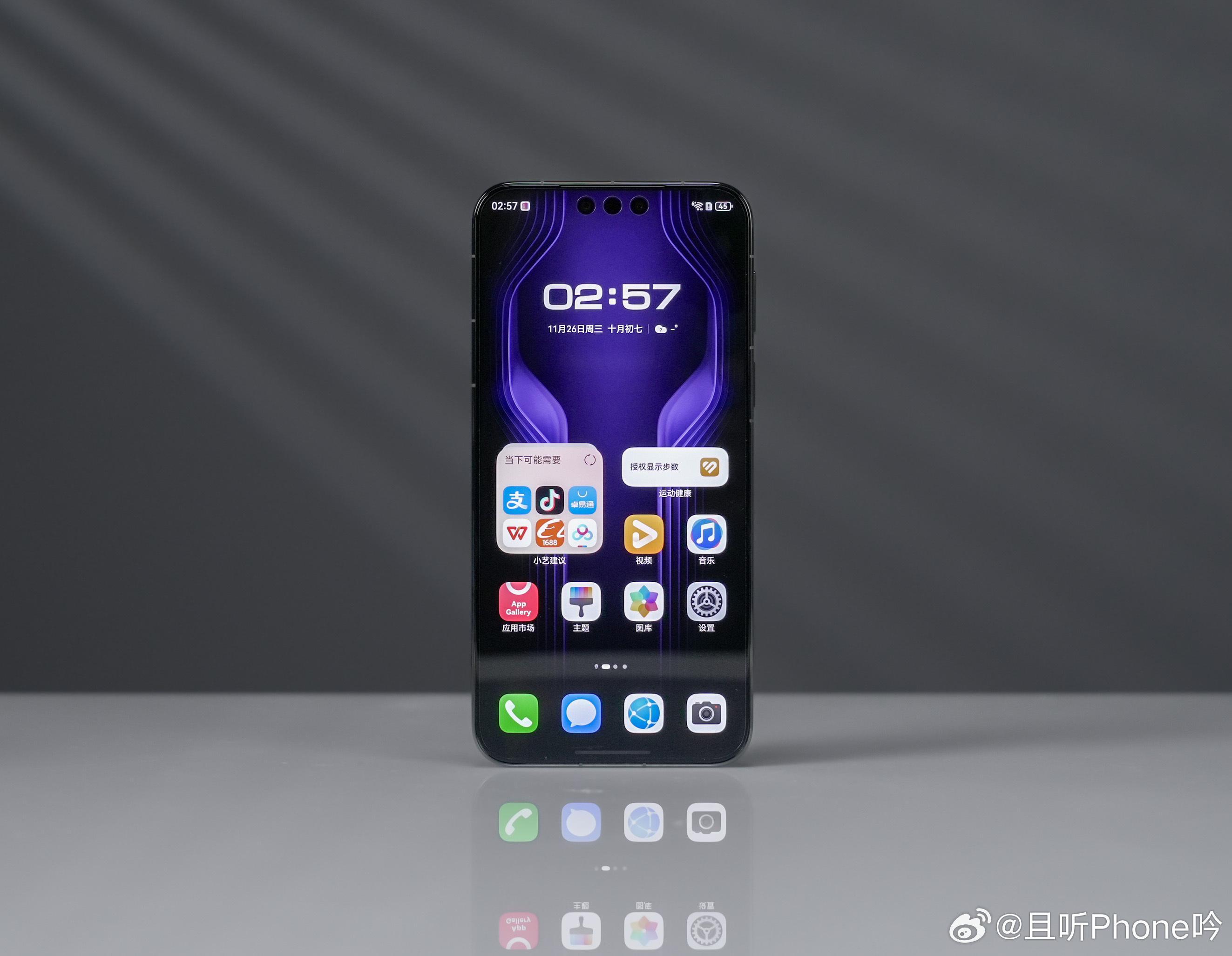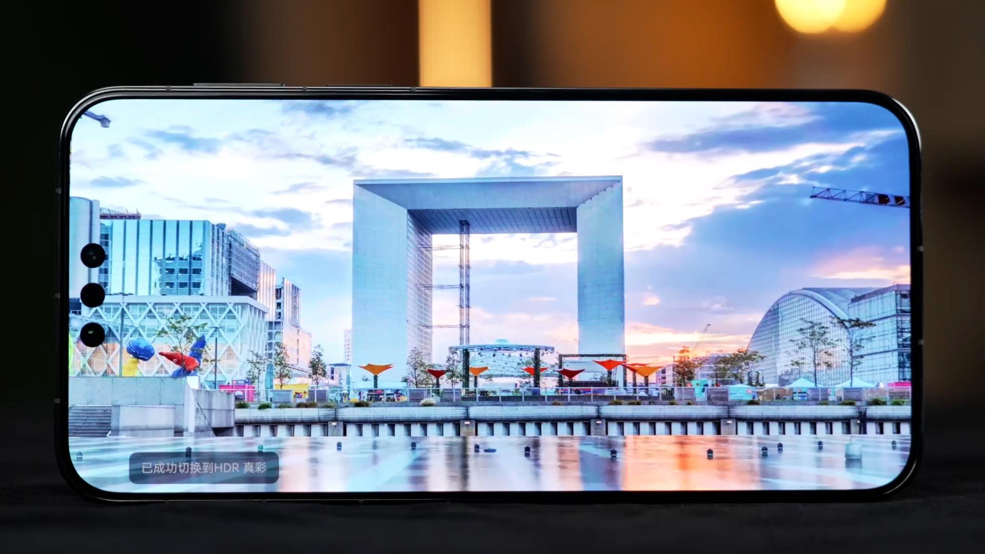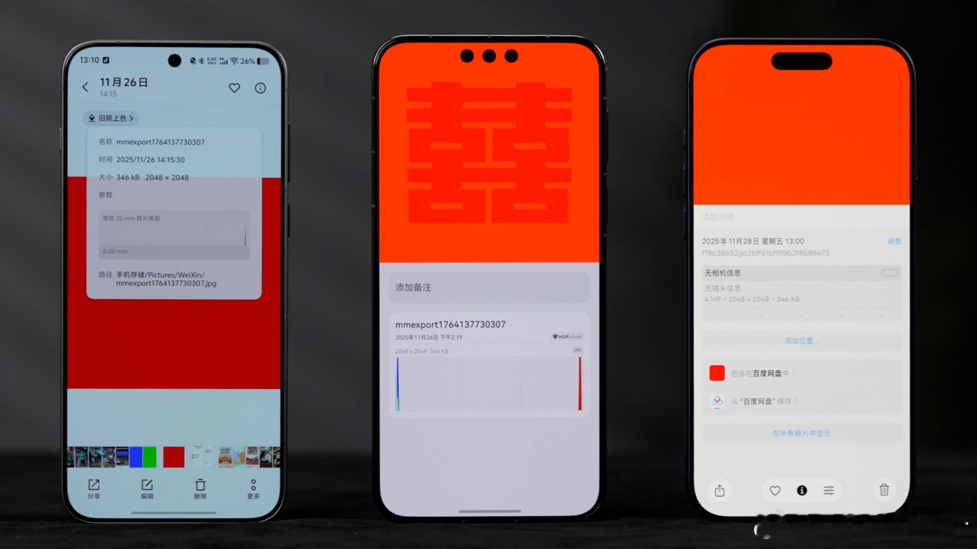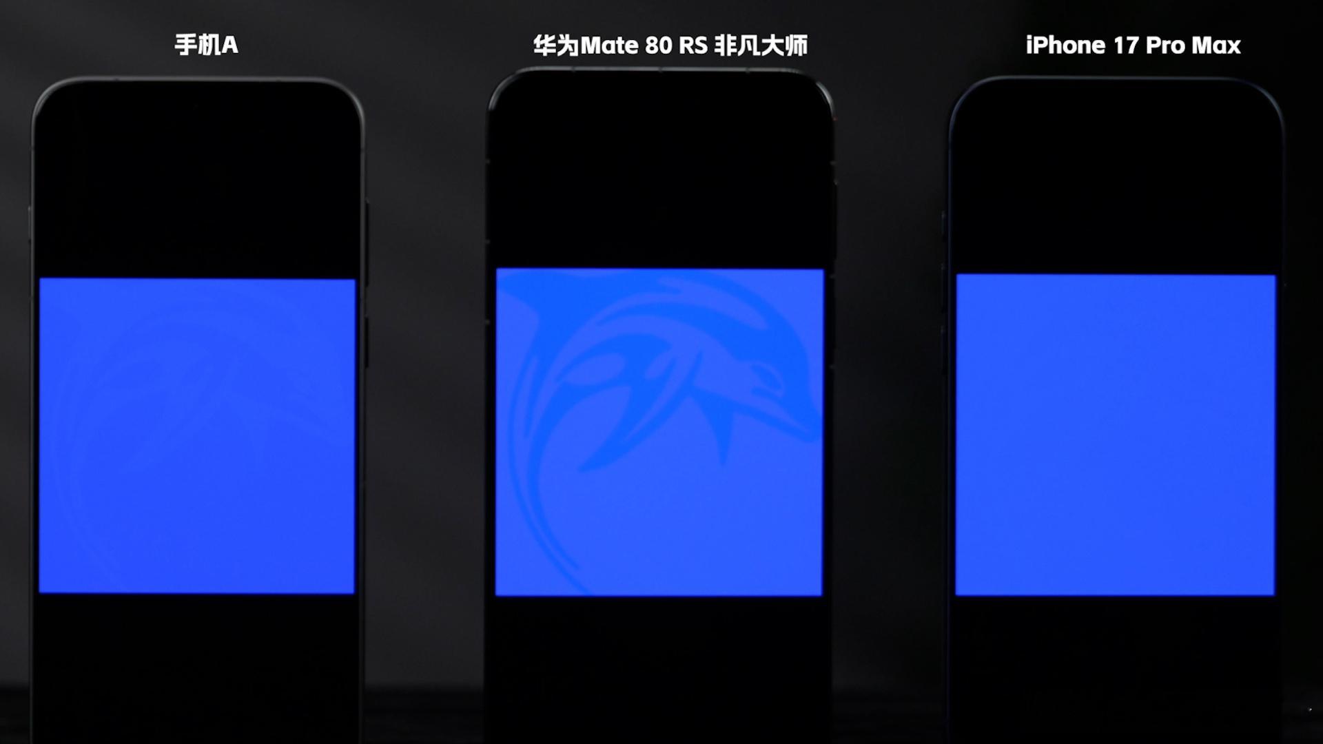 先看两组对比(图1/2),同一张图片在不同手机上的显示效果,图2的“囍”很明显,注意看图1蓝色,其它手机上纯色,而中间80RS是有细节的。之所以80RS有这么大的优势,原因就在双层OLED上,亮度高、色域广。可能平时单看区别不大,但一对比就太明显了,细节明显更多。只要是支持BT.2020色域或HDR Vivid图片、视频和电影,都能感受到更细腻的色彩。不过双层OLED也有缺点,双发光层叠加,每层亮度更低,OLED在低亮度色准不好控制,像华子前代MPP双OLED就有局部发绿的情况。这次80 RS我也特别注意了一下,在暗光场景下,从各种亮度、角度看,肉眼是没发现这个问题。