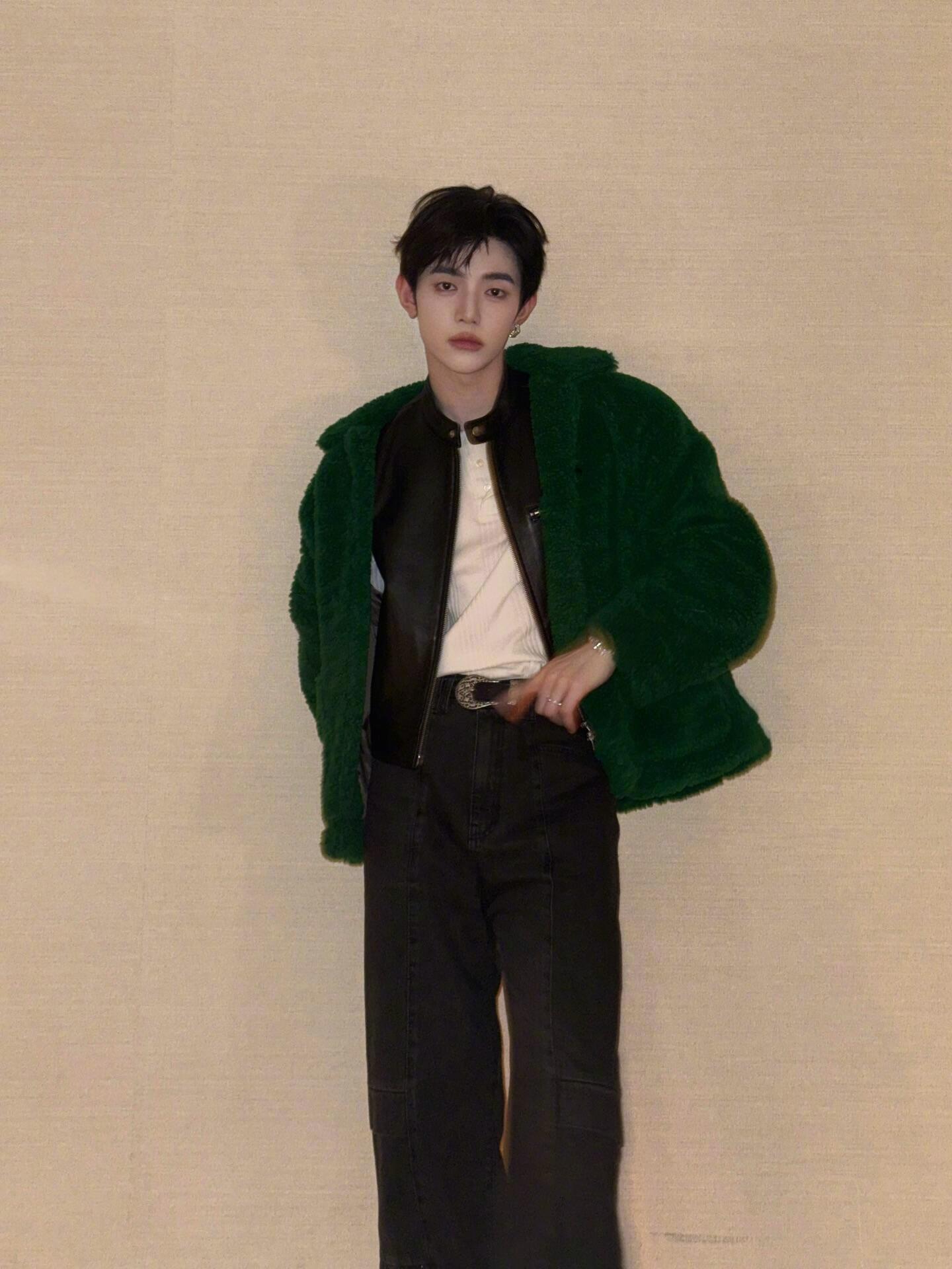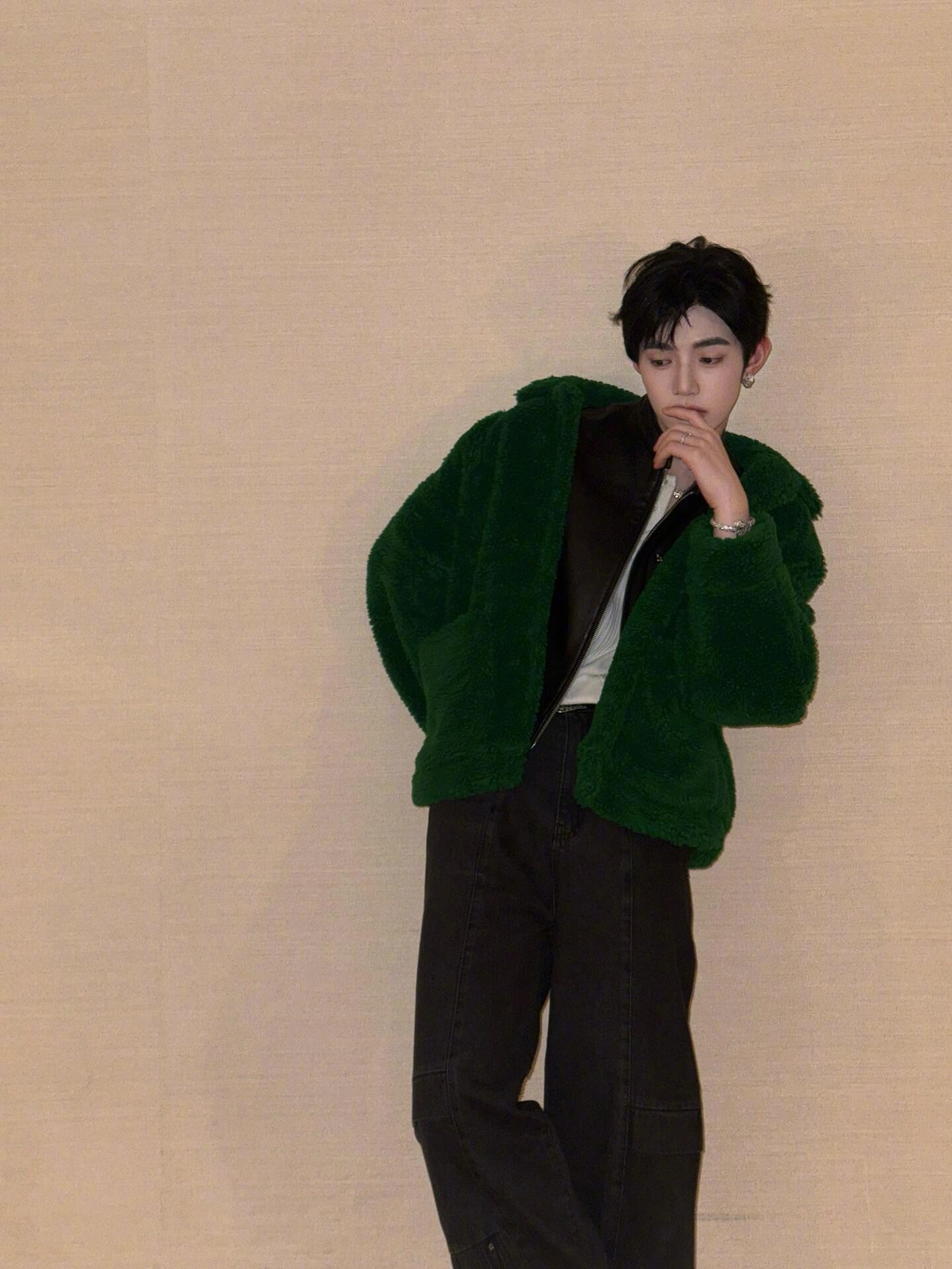 章昊 x BVLGARI章昊营业造型大片,暗绿色毛绒外套搭配皮质夹克,下着深色牛仔裤,全套Bvlgari宝格丽珠宝闪耀亮相,贵气的少爷好带感
