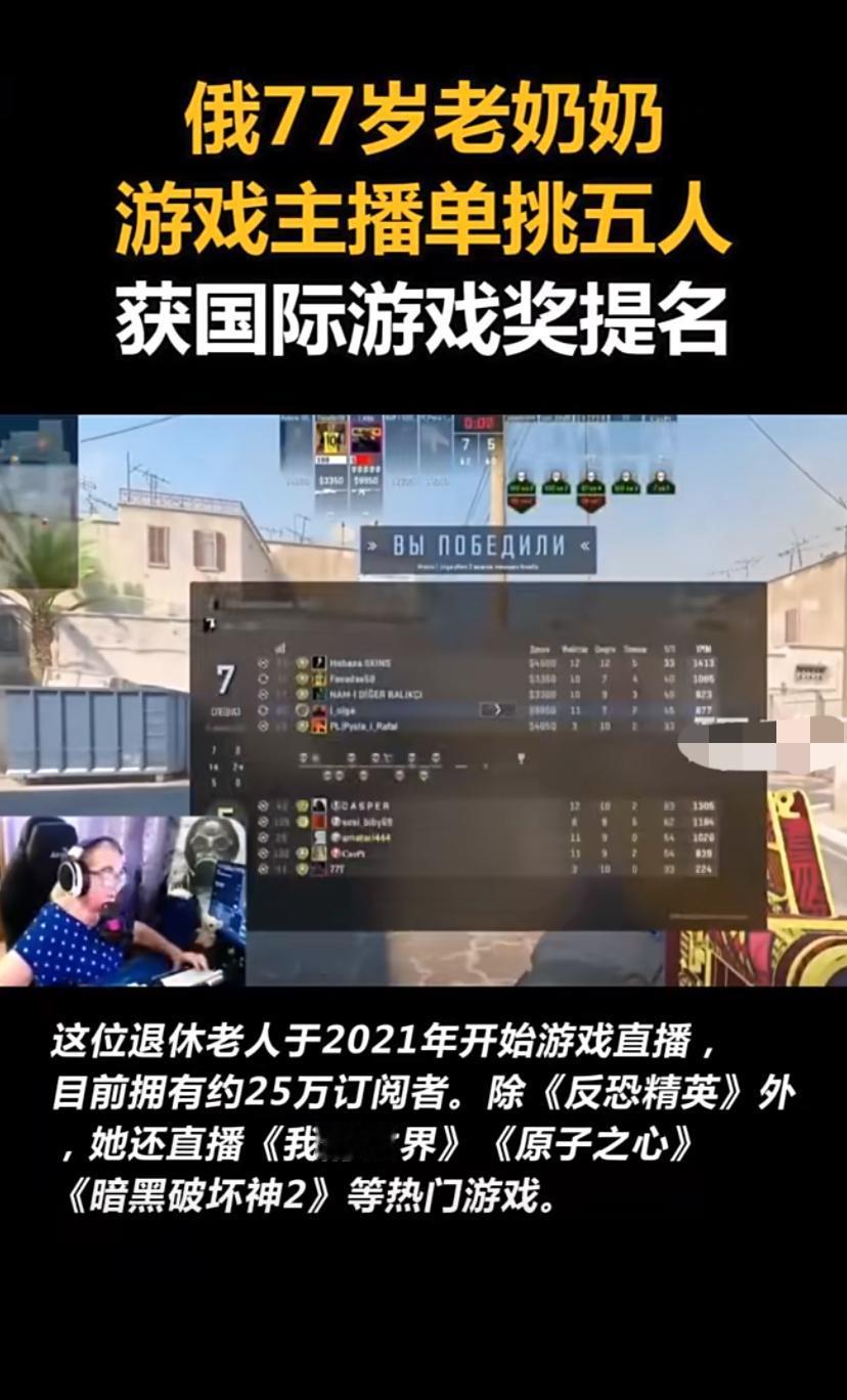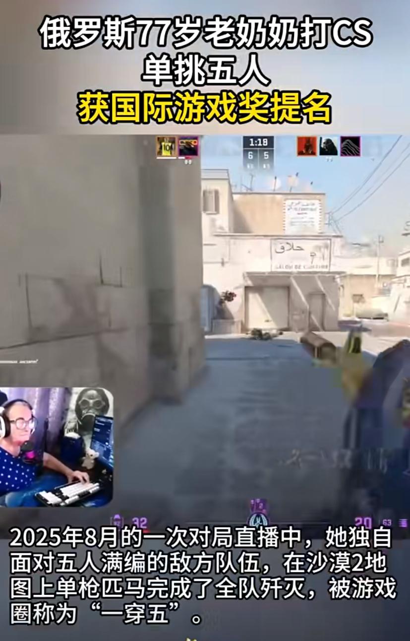77岁奶奶《反恐精英》一穿五!网友:这才是真“老年电竞”! 谁说电竞是年轻人的专利? 俄罗斯77岁的游戏主播奥尔加,用实力狠狠打了这种“年龄歧视”的脸!近日,她凭借在《反恐精英2》中“一穿五”的逆天操作,被提名NNYS最佳游戏时刻奖,震惊全球游戏圈。网友们纷纷惊呼:“我奶奶还在研究怎么用智能手机,人家奶奶已经在FPS游戏里carry全场了!” 这并非个例,“老年电竞”正在全球范围内悄然兴起。 在日本,80岁的“森喜刚”主播U.S. Kiyoshi,凭借在《大富翁》和《大金刚》中的精湛技艺,成为游戏直播界的顶流爷爷,拥有百万粉丝。 在美国,一支名为“银色狙击手”的《守望先锋》战队,平均年龄超过70岁,他们不仅组队训练,还能在线上比赛中与年轻人一较高下,甚至多次获胜。 国内也不乏这样的“硬核大爷”,比如68岁的《英雄联盟》玩家“老李”,凭借一手绝活英雄“盖伦”在峡谷里大杀四方,其操作和意识让不少年轻玩家自愧不如。 这些“老年玩家”用行动证明,游戏无关年龄,只关乎热爱与心态。 奥尔加的获奖,不仅是她个人的荣耀,更是对所有“不服老”精神的最高致敬。网友调侃道:“以后别再说‘你大爷永远是你大爷’了,现在得说‘你奶奶永远是你奶奶’!” 77岁电竞奶奶 老年玩家有多秀 反恐精英