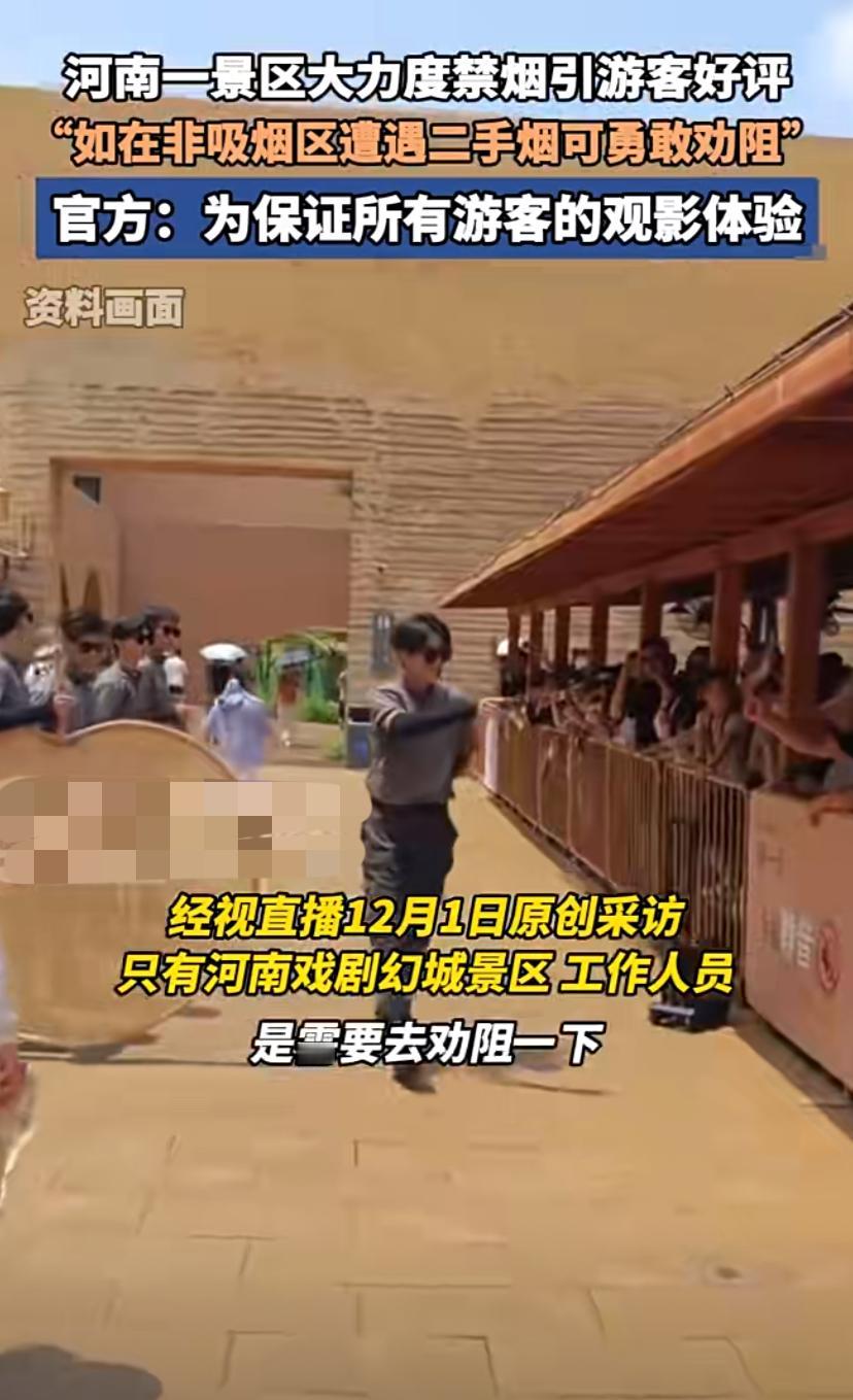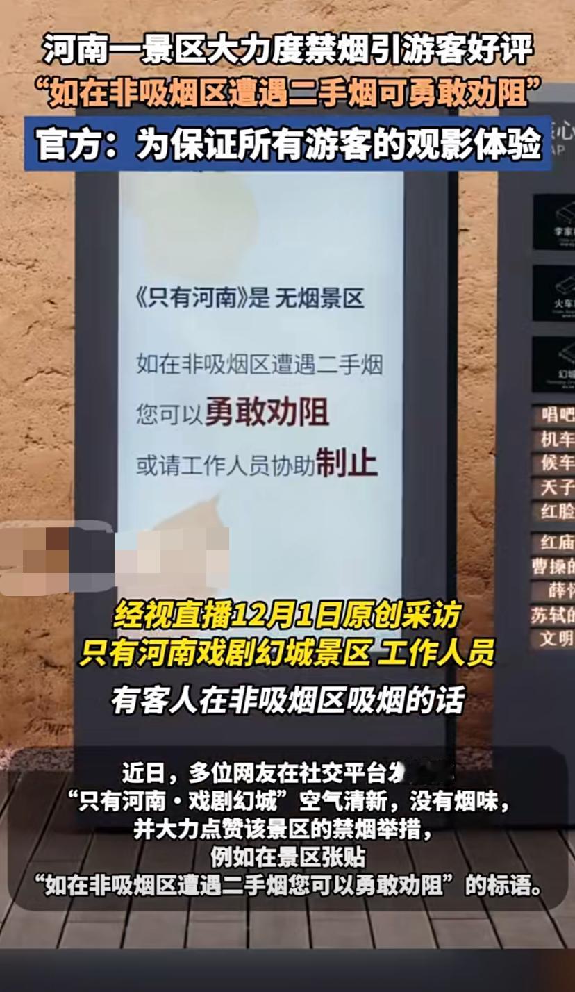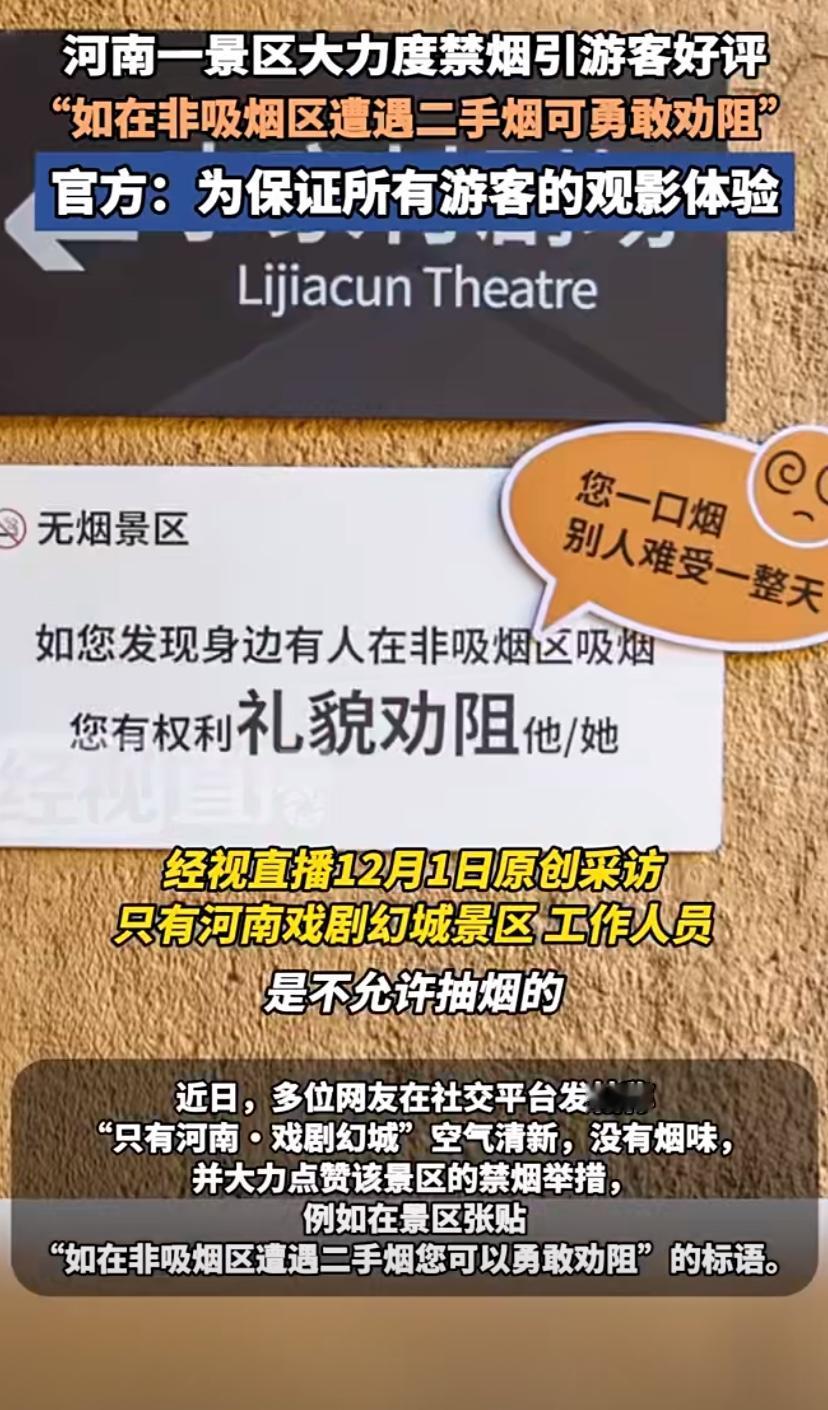 河南景区禁烟标语火出圈!网友:这波操作“上大分”! “抽烟者,罚款200元,并公开检讨!”“您吞云吐雾时,别人在吸‘二手烟’!”近日,河南“只有河南·戏剧幻城”景区内,各种“硬核又接地气”的禁烟标语火遍全网。网友实地体验后发现,景区内空气清新,几乎无人吸烟,纷纷为这种“动真格”的管理方式点赞,称其“为景区文明建设上大分!” 在许多景区,禁烟规定往往形同虚设,游客“吞云吐雾”屡见不鲜,工作人员劝阻还可能引发冲突。而河南这个景区的成功,在于它将“标语”和“执行”完美结合。这种模式并非孤例,北京故宫自2015年起实行全面禁烟,对违规者处以200元罚款,并纳入旅游黑名单,效果显著,如今在故宫内吸烟已是罕见现象。云南大理古城则采取“疏堵结合”的方式,设立专门的室外吸烟区,并组织志愿者巡逻劝导,既满足了部分烟民的需求,又保护了大多数游客的权益。相比之下,一些景区只在入口处贴一张小小的“禁止吸烟”标志,后续管理完全缺失,导致规定沦为一纸空文。网友的评论一针见血:“文明不是靠自觉,是靠管理!河南景区的做法,值得全国推广!” 这场由禁烟标语引发的讨论,实际上是对如何提升公共空间文明水平的一次深刻反思。 河南景区禁烟 只有河南戏剧幻城 文明旅游