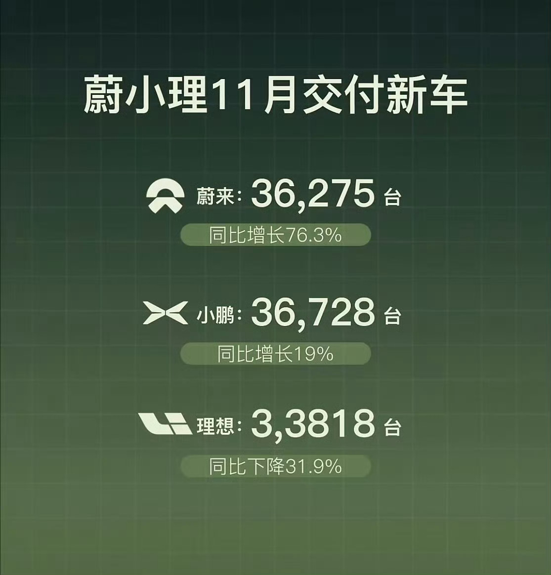理想其实真的挺强的,大比例下滑后居然还有超过三万的销量,i6确实也卖得不错。反正这时候各种补贴退坡,大家的销量都回退了一些,等过了12月吧。大v聊车