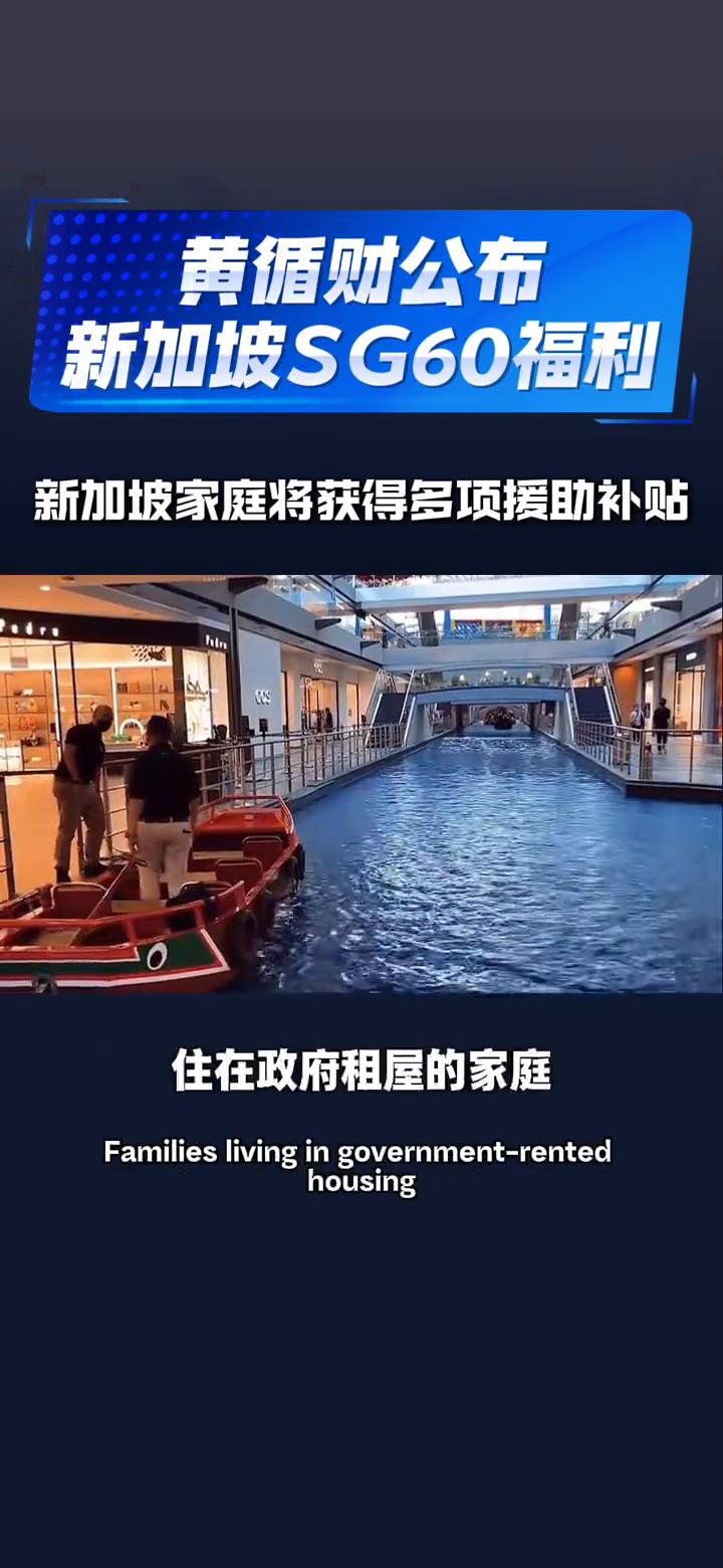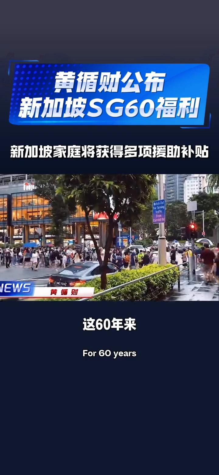 黄循财公布新加坡SG60福利,新加坡家庭将获得多项援助补贴。 所有年满21岁的国人将获得一笔600元的SG60购物券。我知道生活费和商业成本的上涨给大家带来了不少压力,因此政府会提供更多援助来减轻国人的负担。 每个新加坡家庭将获得800元的CDC邻里购物券,住在政府租屋的家庭也会获得额外的水电费回扣。为减轻家长们的负担,我们将为每个12岁及以下的新加坡儿童提供500元的育儿补助券。我们也会为每个13岁到20岁的新加坡学生提供一笔500元的教育互助补贴。 企业方面,我们将提供公司税回扣,并更好的帮助雇主共同承担低薪员工的加薪成本。这60年来一代代国人共同耕耘,也应该共享成果。为了感谢大家的努力和付出,我会推出一项SG60配套,让所有国人分享国家繁荣发展的果实。所有年满21岁的国人将获得一笔600元的SG60购物券。 在这次的预算案中,我们制定了明确的计划让国家稳步前进。所谓人心齐,泰山移。我相信只要大家团结一致,我们肯定能再攀高峰,共同实现。