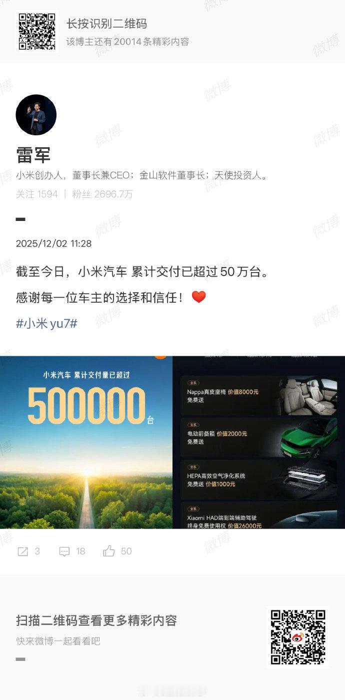 雷军回应小米汽车交付量已超全年目标雷军回应小米汽车交付50万台12月2日,发文:截至今日,自2024年4月3日以来,小米汽车 累计交付已超过50万台。11月交付量持续超过4万台,2025年的交付量已超过了年初设定全年目标:35万台。随后,