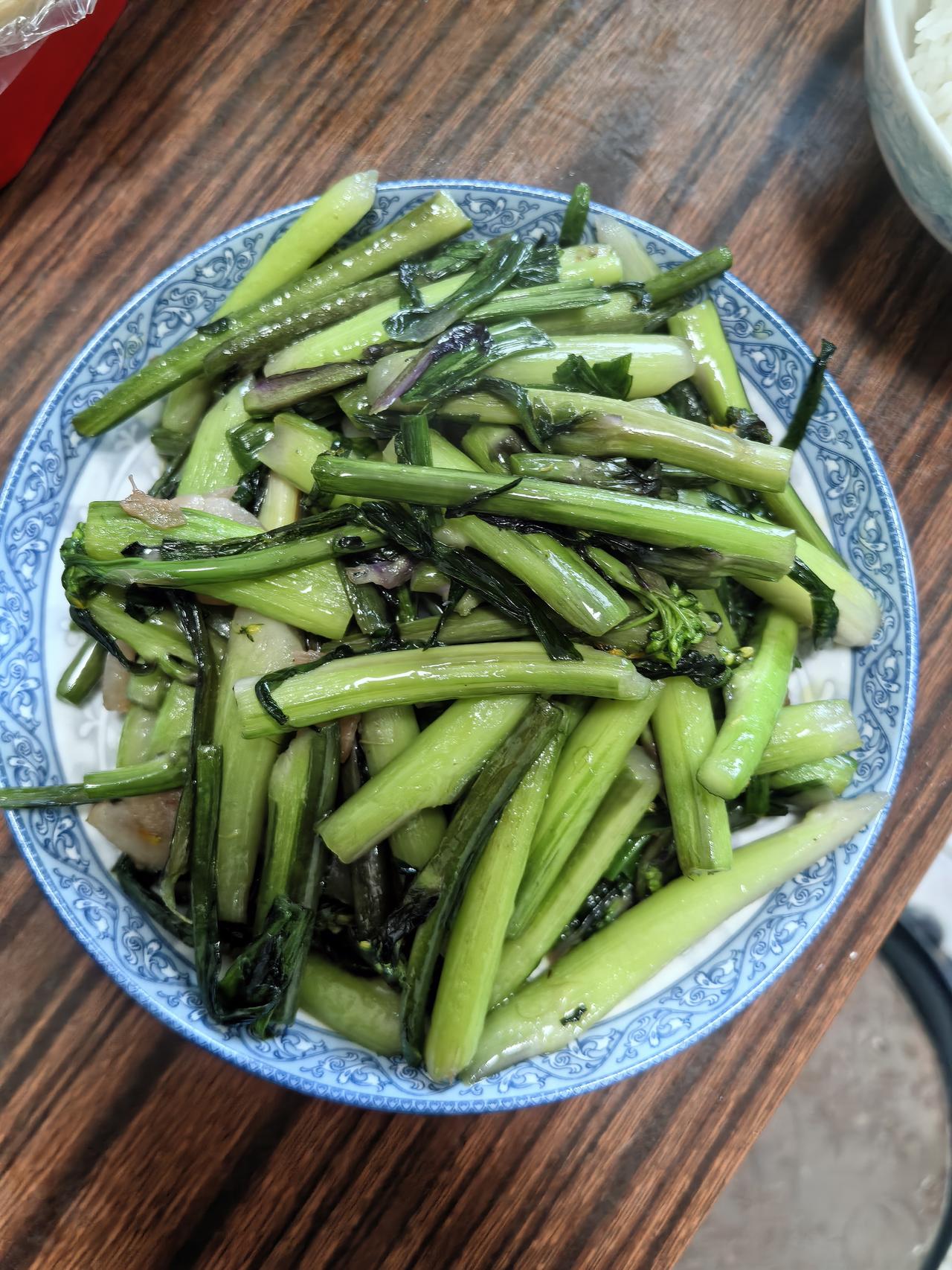 最爱吃的红菜苔 时下,最鲜美的蔬菜,莫过于红菜苔了吧它是我的最爱。 市场上买一把农村人自家种的红菜苔,2.50元,正好炒一盘。昨天有网友说拿刀切成段,洗干净了再炒。这样做一看就不是正宗的湖北人,我们湖北人做这道菜,是拿手把红菜苔掐成段,菜苔最粗的根部老皮剥掉,拿刀劈开,方便熟和入味。然后洗干净后沥干水分。 有条件的切两片腊肉,没有腊肉的放点点猪油也可以,不爱吃猪油的清炒也行。 准备好姜丝,干辣椒两个,大蒜瓣三个,起锅炒油,我喜欢放两片腊肉,把肉炒香炒出油脂后,炸姜、大蒜、干辣椒,然后倒入红菜苔煸炒,直到菜苔软趴,放点点盐,胡椒粉入味,喜欢吃酸的放点点锅边醋,再扒拉一下就可以起锅啦。 爆炒红菜苔超级下饭,我能一直吃它,百吃不厌,直到红菜苔下市为止。 有没有友友和我一样偏爱这道菜的?您那里还有红菜苔其他做法吗?评论区留言告诉我一下哦。红菜苔种植 武汉菜苔 栽红菜苔 红菜苔挑选