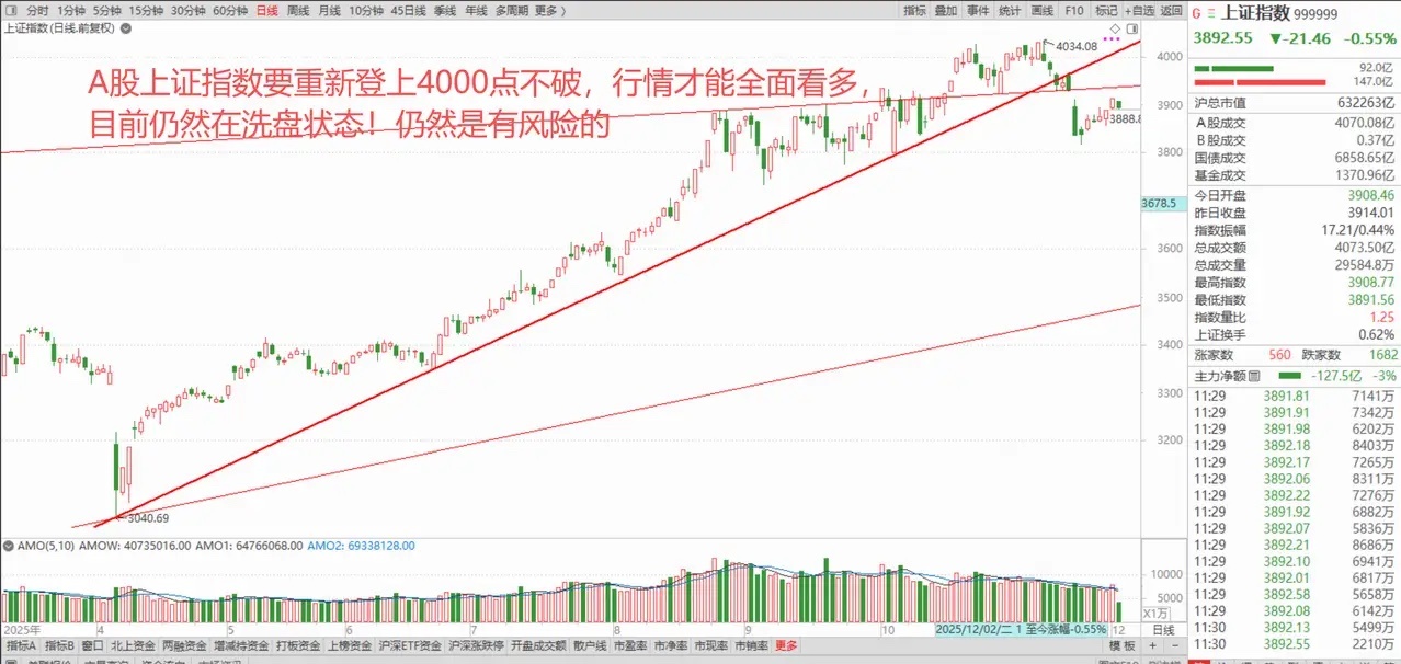 A股沪指跌破3900点,港股科技股上午11时突发跳水!12月行情怎么看? 1、昨夜欧美股市跳水了 在美股经历了5连阳的反攻行情之后,由于昨天周一亚太股市日、韩、澳走弱,带动昨晚欧洲股市、美国股市跳水。同时昨日的虚拟币大跌,也给美股的风险资产带来利空影响。昨夜美股收盘三大指数齐跌,道指跌0.9%、纳指跌0.38%、标普500跌0.53%。 2、中概股逆势上涨 昨夜美股中概股没有跟跌美股,阿里巴巴由于近期向AI应用端大举发力,不仅近期发布了千问大模型APP,还发布了AI眼镜,昨夜股价上涨4.42%,带动纳斯达克中国金龙指数上涨0.87%。同时昨夜A50期指夜盘也没有跟跌,凌晨收盘上涨0.13%。 3、亚太股市企稳了,但是港股高开回落! 周一全线走弱的亚太股市,今天反而走强,北京时间中午12点,韩国股市大涨1.67%,日本和澳大利亚股市微涨0.27%和0.16%,起码企稳了。港股恒生指数原本早盘强势,直接跳空高开了0.6%,可惜上午11点跳水,午间涨幅回落到0.16%。恒生科技指数更是大幅度跳水,早盘高开0.76%,午间收盘下跌0.53%。 4、A股走弱,跌破3900点。 跟早盘港股的强势不同,A股开盘就走弱,沪指低开0.14%以后,震荡下行,午间收跌0.55%,收在3892点。科技股跌幅居前,深证成指、创业板指、科创50指数午间收盘跌幅分别为:0.77%、0.88%、1.18%。昨天上涨的强势方向集中回踩了。 5、仍处于洗盘状态 虽然科技股再遇回踩,倒不用悲观,原因有几点:其一,上午两市成交额仅1.05万亿,比昨天上午缩量1796亿,上涨放量,下跌缩量,是上涨行情洗盘的明显特征之一;其二,目前外围和内部局势无事件推动的利空影响,只是常规洗盘;其三,12月是机构唱多窗口期,是布局春季躁动行情的有利时机。 综上所述,还有一点重要原因,是12月可能有政策支持,包括但不限于降准降息的可能,以及创业板的新版上市标准,同时比较确定的是,有两个科创板GPU公司将于12月上市。