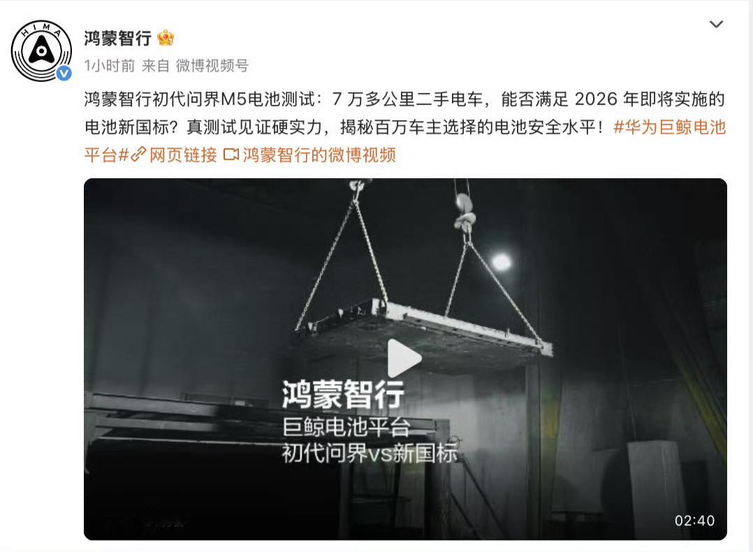 华为巨鲸电池平台提前5年满足新国标新国标首次将不起火不爆作为强制标准 提前5年满足新国标??真不愧是鸿蒙智行,确实安全是最大的豪华👍