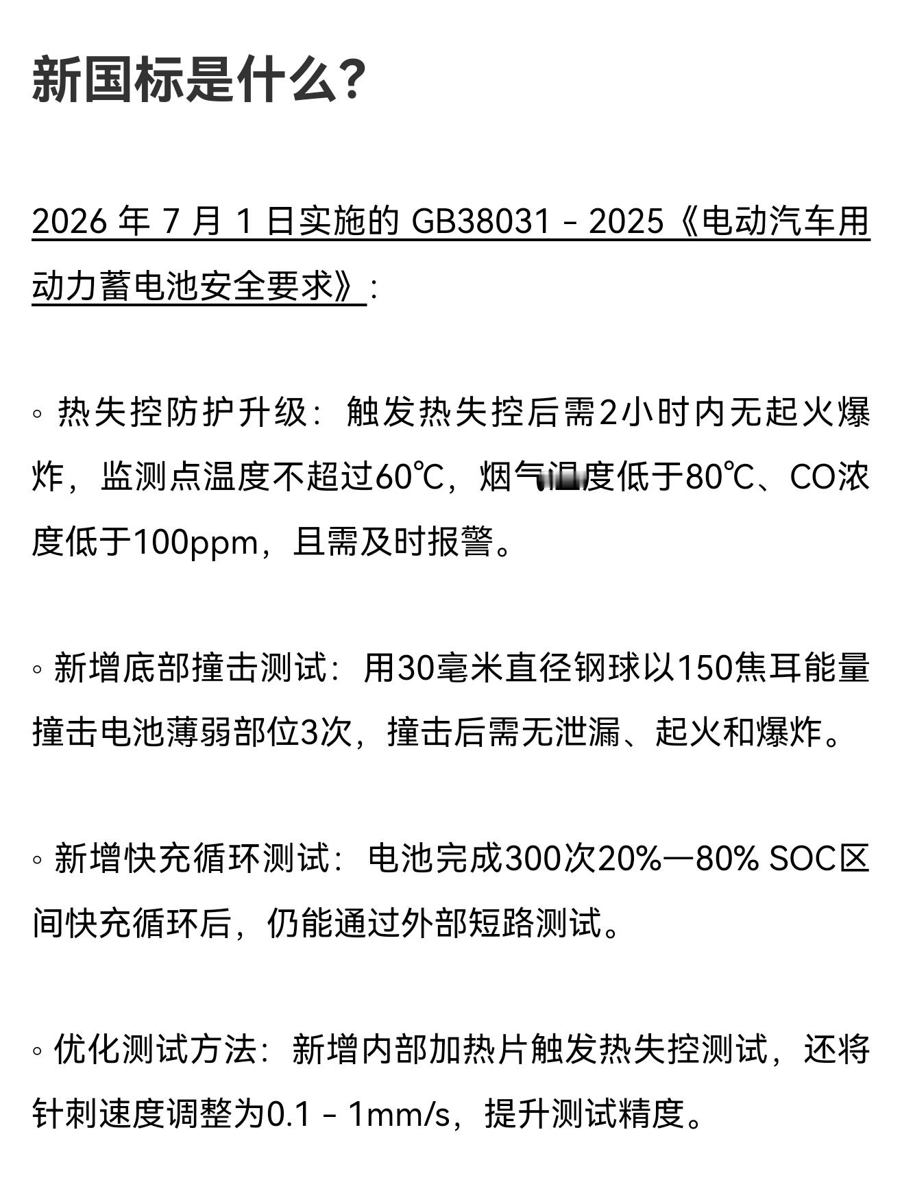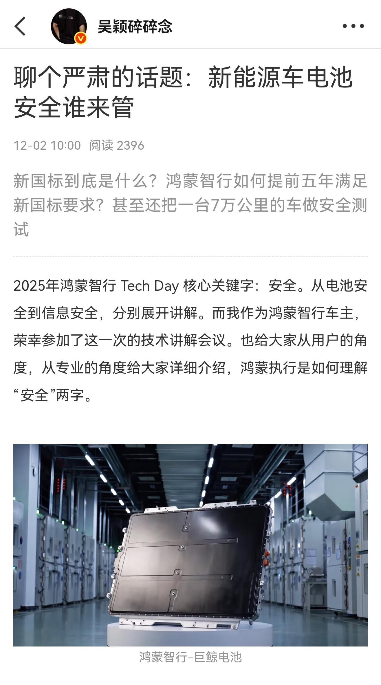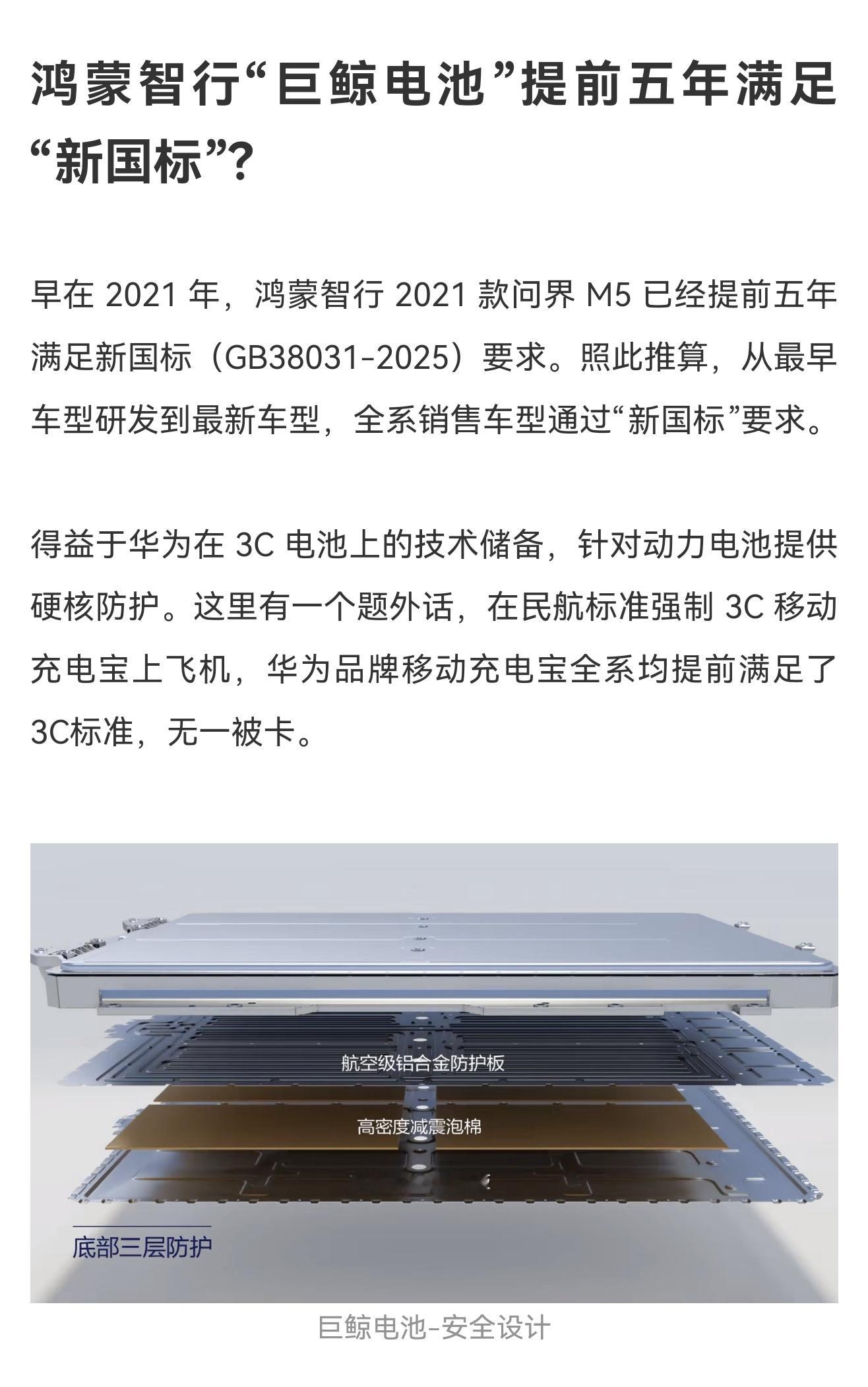 为了让大家有更好的阅读体验,特意把长图解出来给大家慢慢阅读。看完这一篇内容肯定会对动力电池的安全有了更深刻的了解。对接下来购车技术分析等等都有很大的帮助。华为巨鲸电池平台提前5年满足新国标新国标首次将不起火不爆作为强制标准