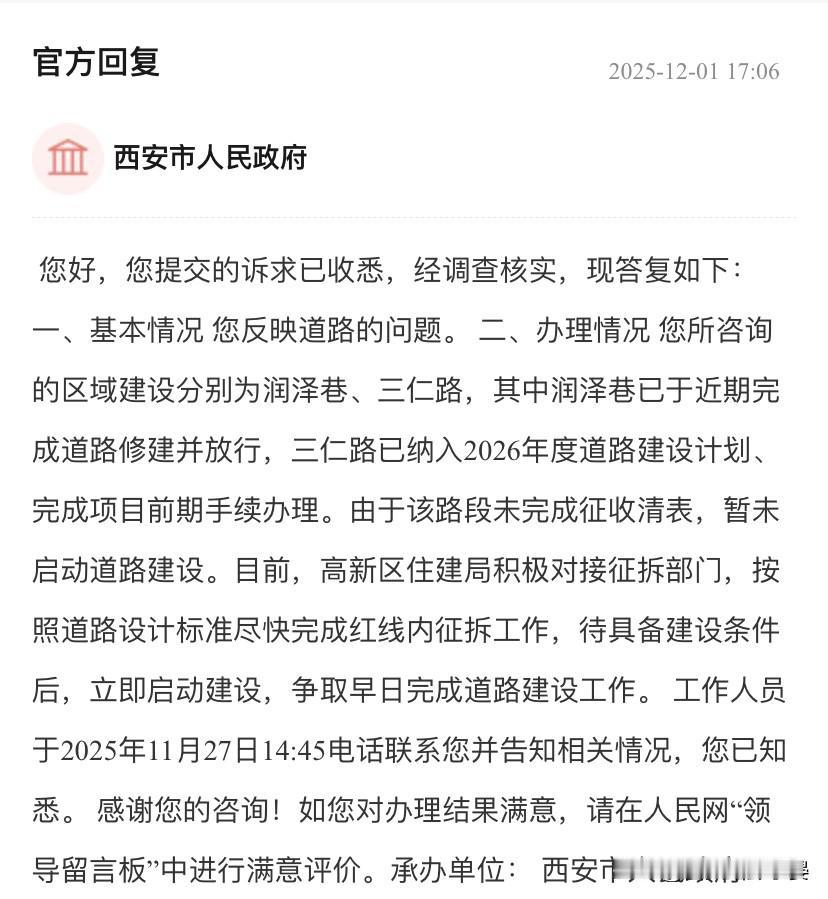 高新三期西太路以东道路维修问题 我是高新三期招商臻境业主,该小区属于高新CID小区,但是小区北面的三仁路道路情况及其恶劣,小区以东的片区荒草丛生,完全与之前规划不符,该区域居民周围生活条件恶劣,严重影响日常生活出行,请问小区的北边道路和东边道路何时维修,后期规划能否兑现。 官方回复 2025-12-01 17:06 西安市人民政府 您好,您提交的诉求已收悉,经调查核实,现答复如下: 一、基本情况 您反映道路的问题。 二、办理情况 您所咨询的区域建设分别为润泽巷、三仁路,其中润泽巷已于近期完成道路修建并放行,三仁路已纳入2026年度道路建设计划、完成项目前期手续办理。由于该路段未完成征收清表,暂未启动道路建设。目前,高新区住建局积极对接征拆部门,按照道路设计标准尽快完成红线内征拆工作,待具备建设条件后,立即启动建设,争取早日完成道路建设工作。