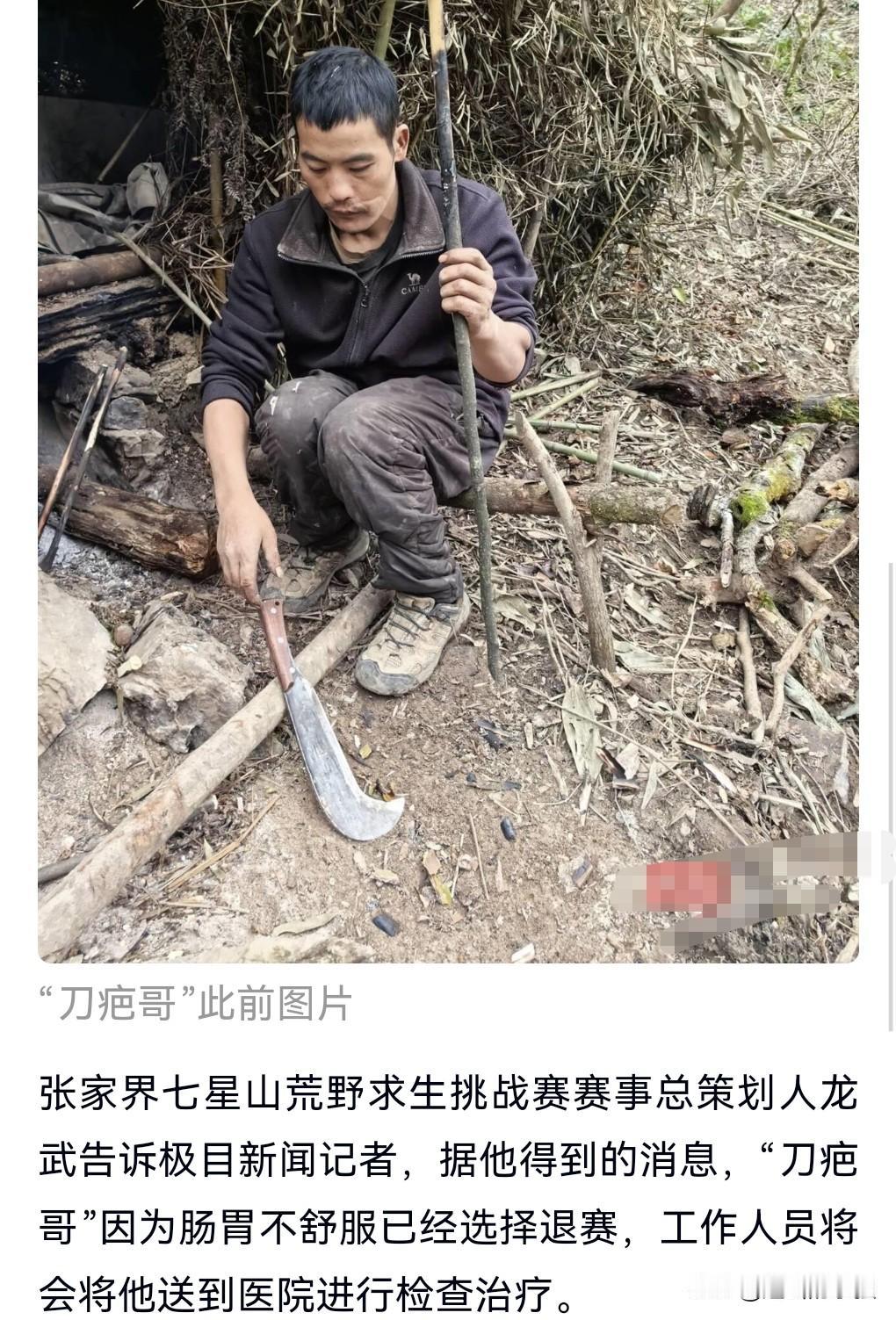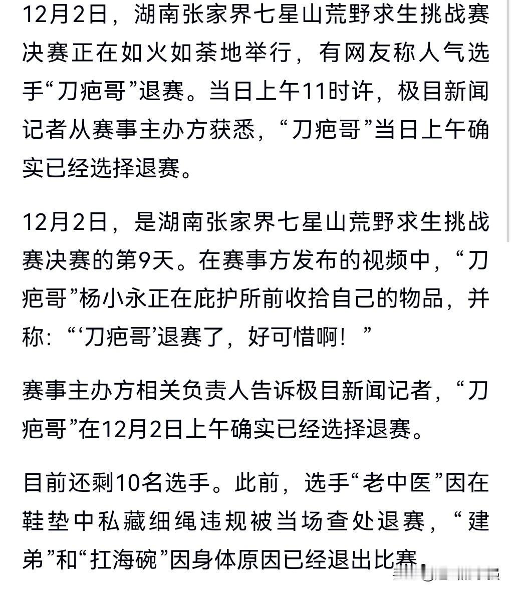 退赛就对了,这也是没办法的事情,毕竟身体扛不住了。 身体是革命的本钱,什么奖励名誉金钱都要给健康让步。 12月2日消息,荒野求生比赛,刀疤哥退赛。 目前还剩10个人。 天气越来越冷了,还搞什么荒野求生啊? 真的是太折磨人了。 这样的比赛就该在夏天举行。