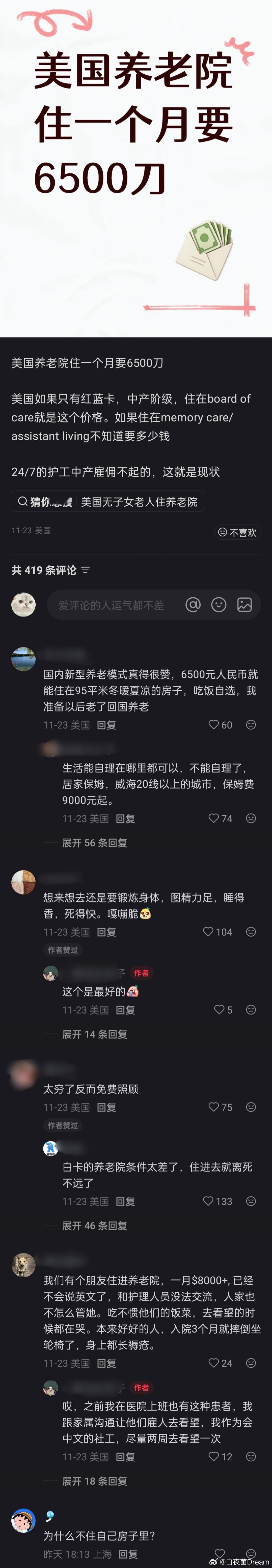 美国养老院住一个月要6500美元,实在是太贵了。有网友表示,国内的新型养老模式真的很赞,准备以后老了回国养老。海外新鲜事