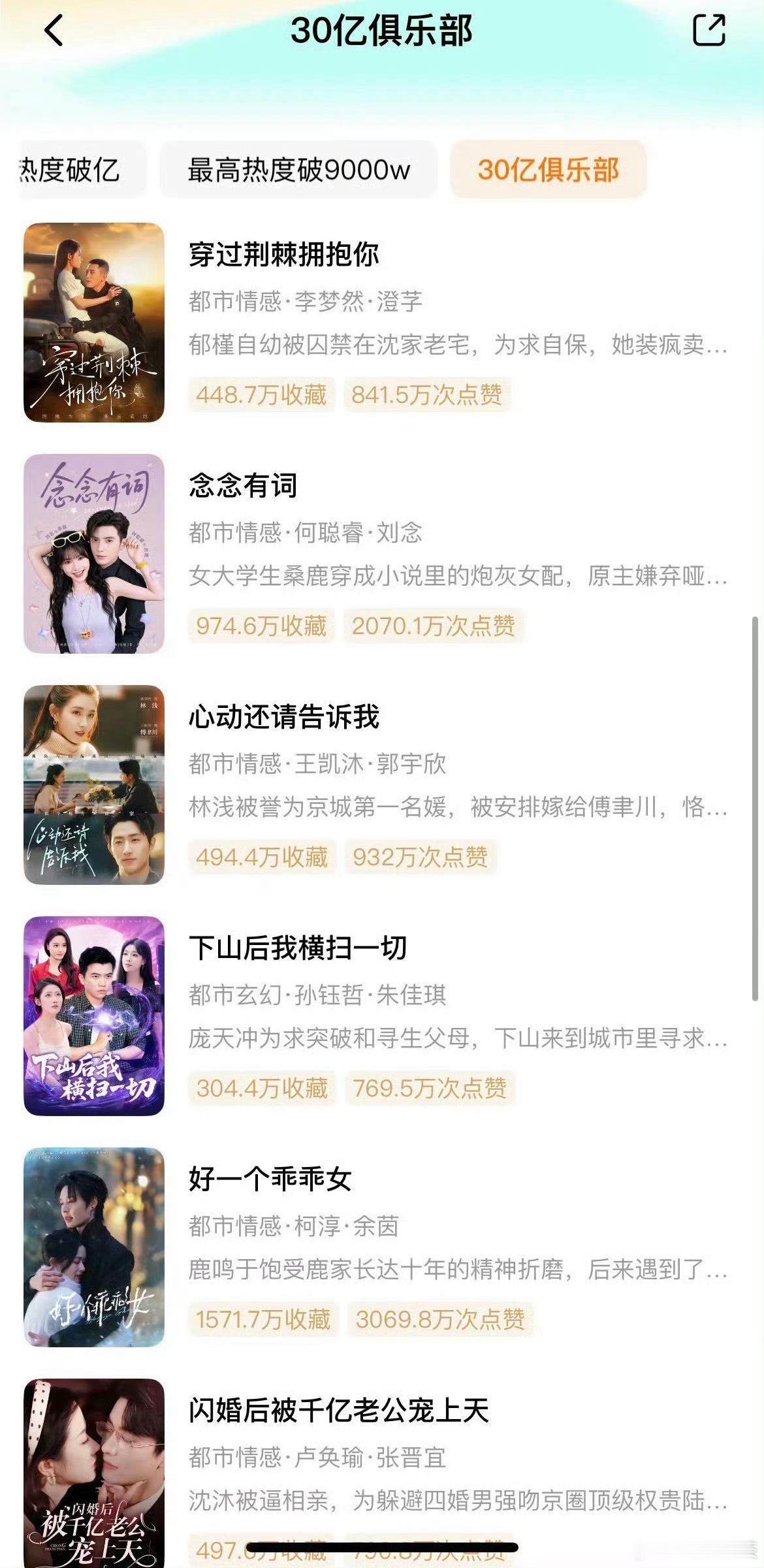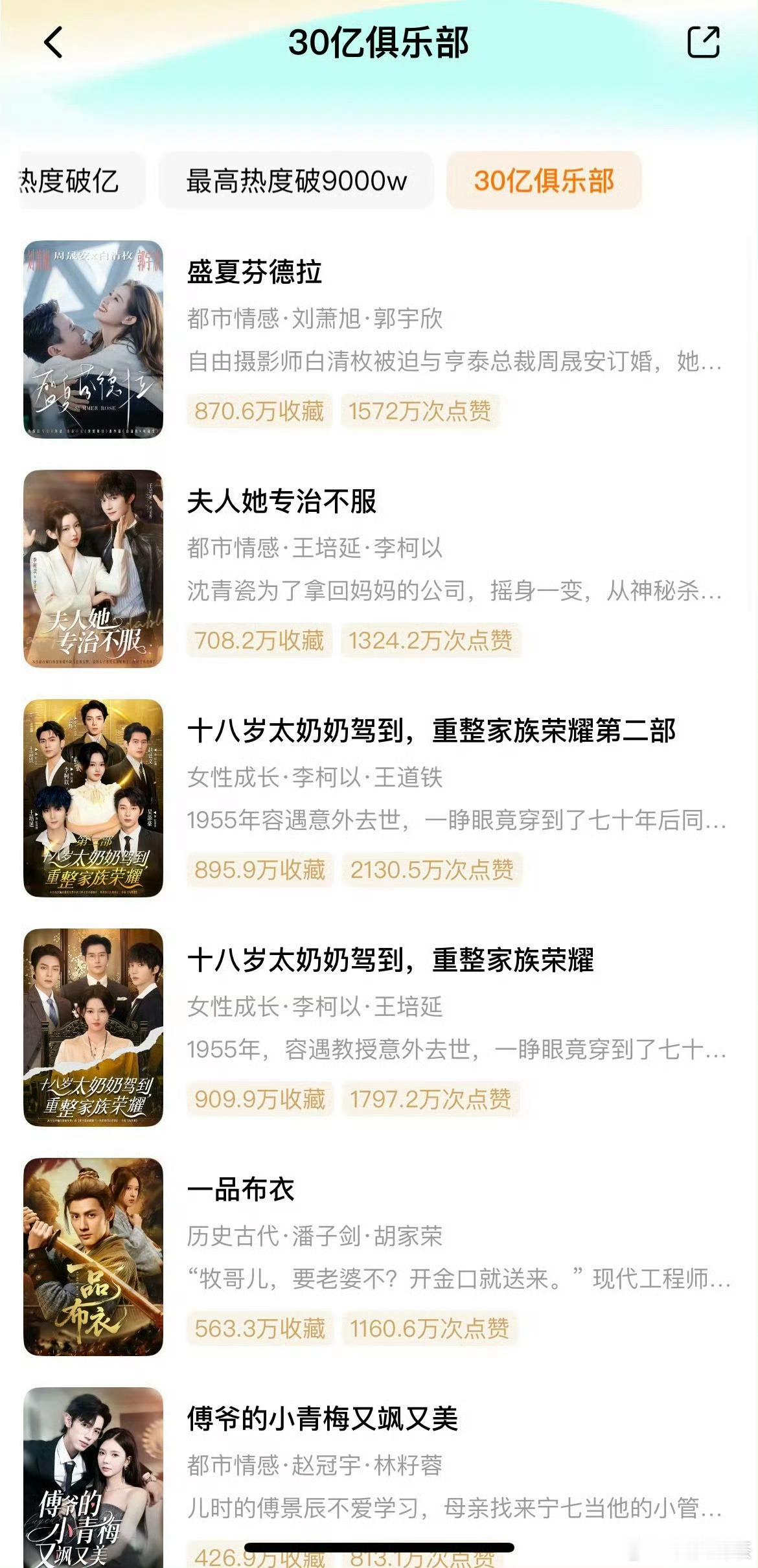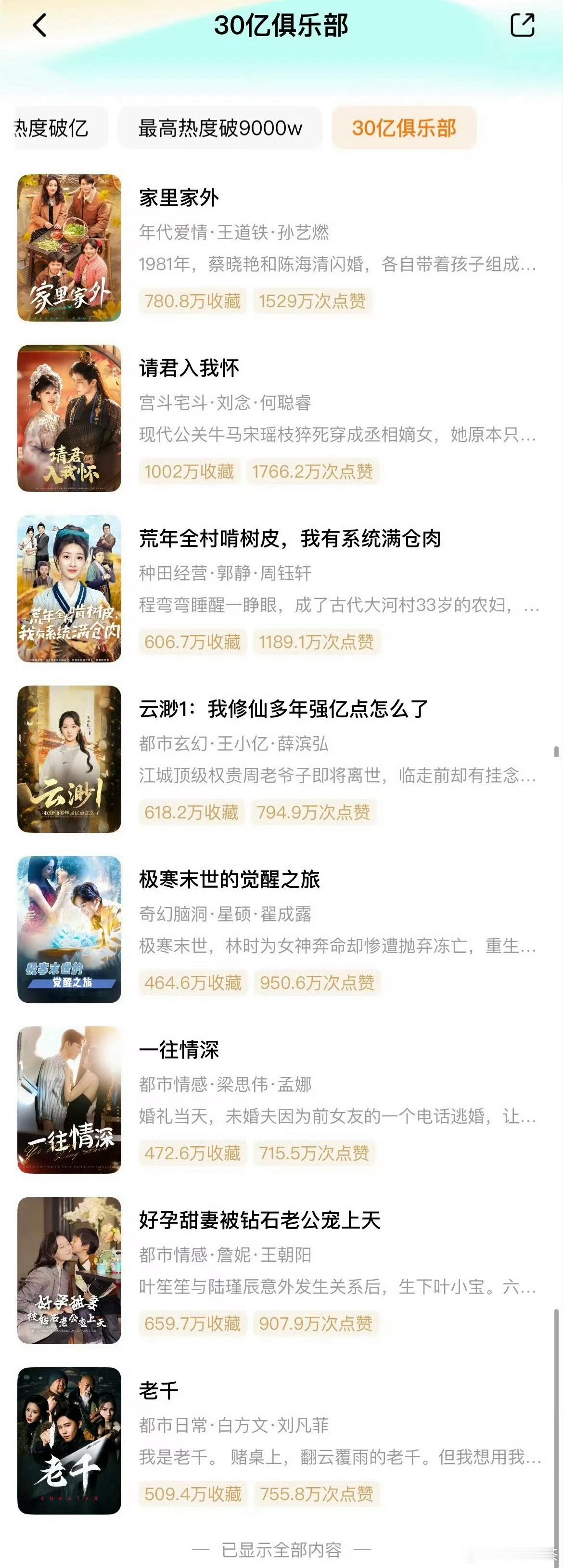 30亿俱乐部的20部剧我看了:《盛夏芬德拉》《夫人她专治不服》《十八岁太奶奶》《一品布衣》《念念有词》《心动还请告诉我》《家里家外》《请君入卿怀》《荒年全村啃树皮,我有系统满仓肉》《云渺》《极寒末世的觉醒之旅》《老千》