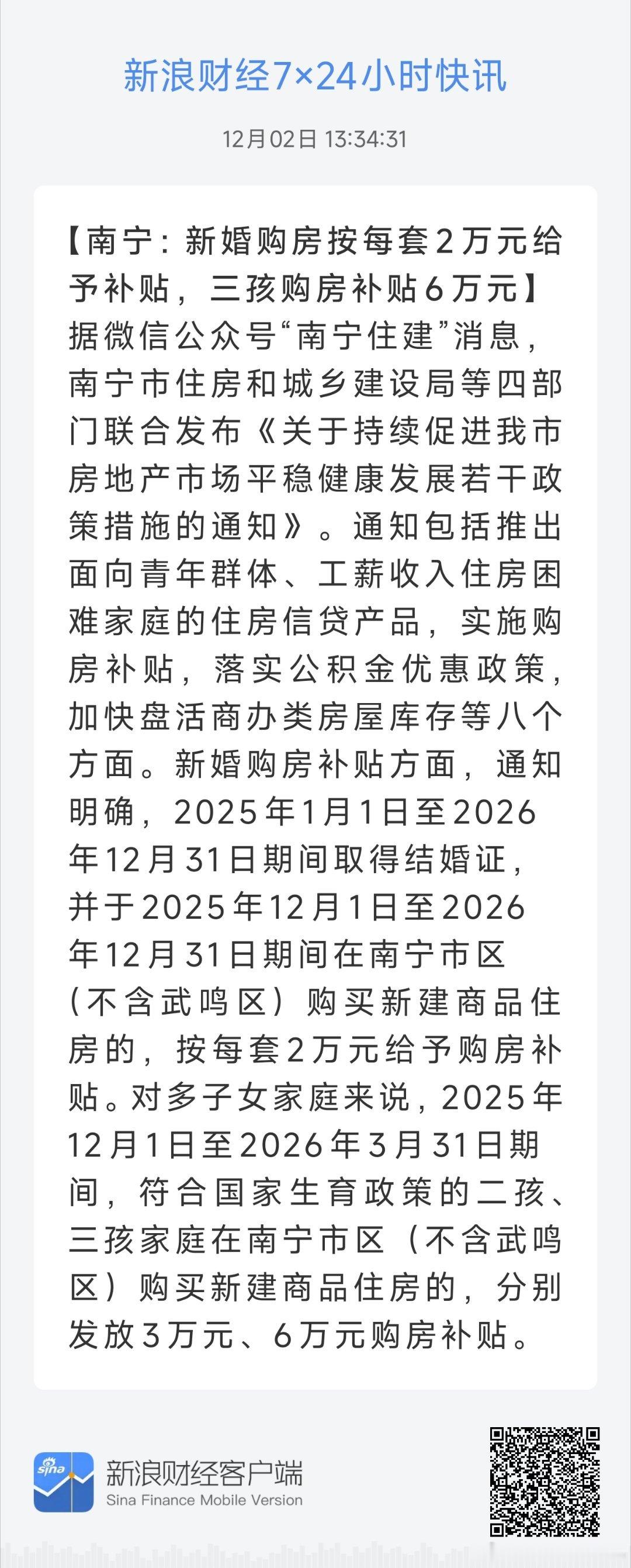 南宁:新婚购房按每套2万元给予补贴,三孩购房补贴6万元