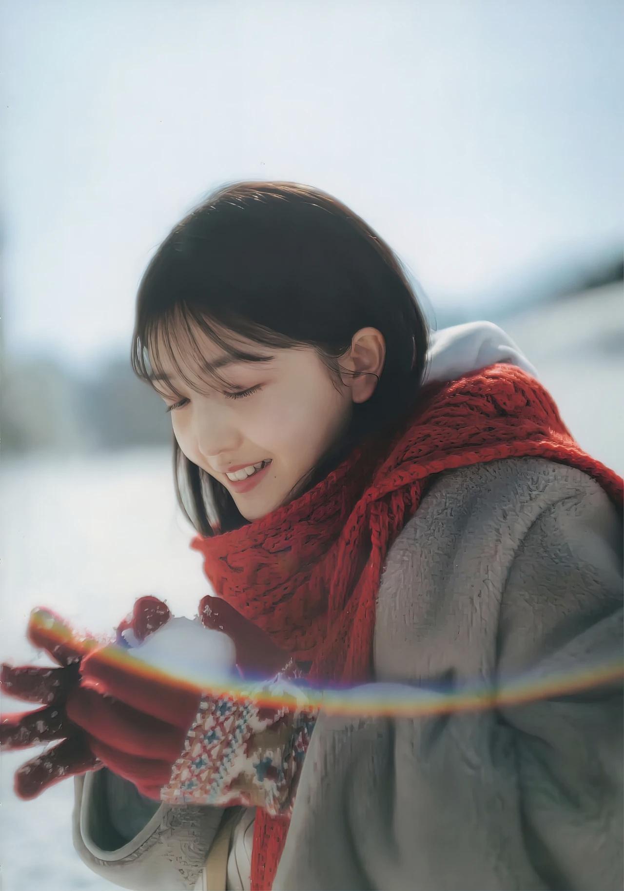 冬日穿搭风格,冬日暖阳,红围巾与雪地相映成趣,更显年轻活泼动人。冬日少女穿搭