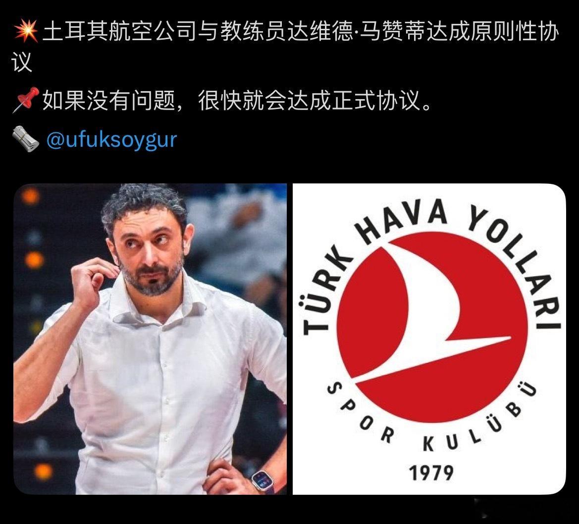 【土耳其航空与马赞蒂将达成协议】土耳其航空公司俱乐部与教练员达维德·马赞蒂达成原则性协议世界女排新闻 如果没有问题,很快就会达成正式协议。