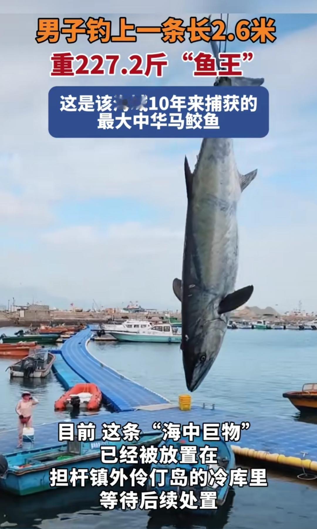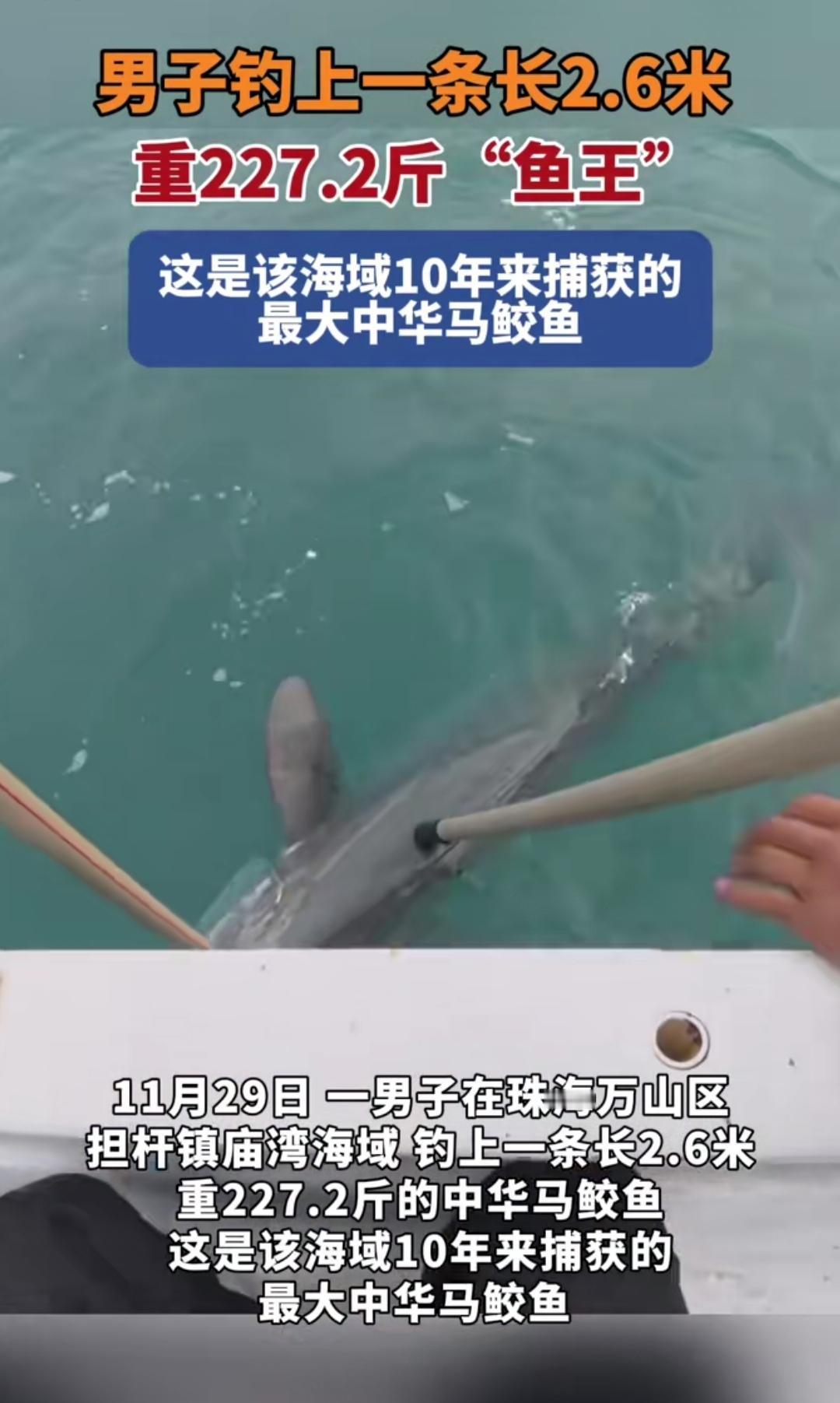 今天刷到珠海庙湾海域的视频,鸡皮疙瘩都起来了——一位钓友的钓竿弯得像要崩断,脚下防滑鞋在船板磨出白印,几个人喊着号子拽了半小时,水里的东西才露了头。 那是条2.6米长的中华马鲛鱼,往秤上一放:227.2斤!比成年人大半头,围观的大叔拍着腿喊“我打了40年鱼,头回见这么大的!”这还是这片海10年来最大的鱼。 现在这“海中巨物”已经冻在外伶仃岛的冷库里,可我更在意的是:前几年这片海还飘着油污,小鱼都少见。这两年禁渔严、护海勤,海水清了,鱼才敢长这么大。这条“鱼王”哪是钓上来的?是大海给咱们的“生态成绩单”啊。