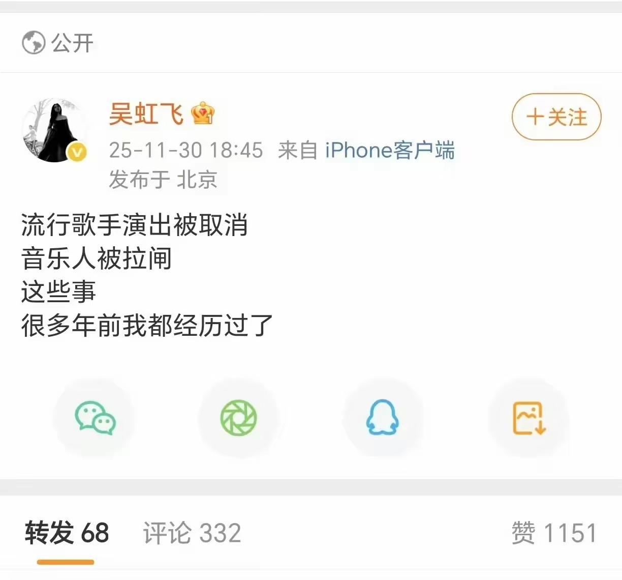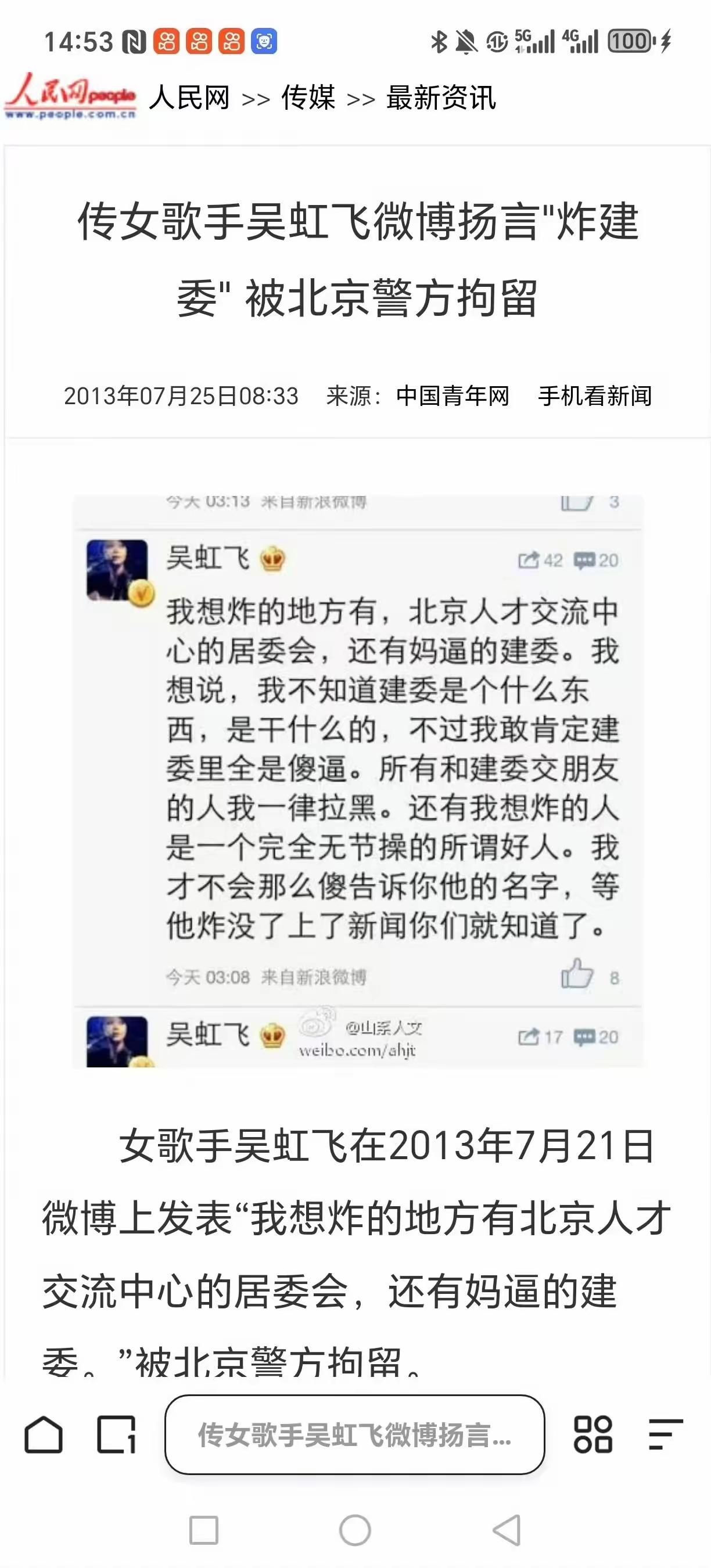 日本歌手在中国内地的演出被取消,中国歌手吴红飞不乐意了,愤懑地说,自己也经历过,仿佛自己受了多大委屈,还要替日本歌手抱不平。咱没听过她的歌啊,查查她吧。一查,好家伙,原来是扬言要炸居委会和住建委,被拘留了。她都要搞恐怖袭击了,取消她的演唱会那不是必须的吗,谁知道她在演唱会上会不会炸这炸那的啊,不冤。