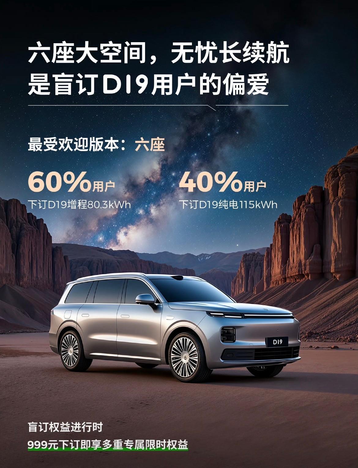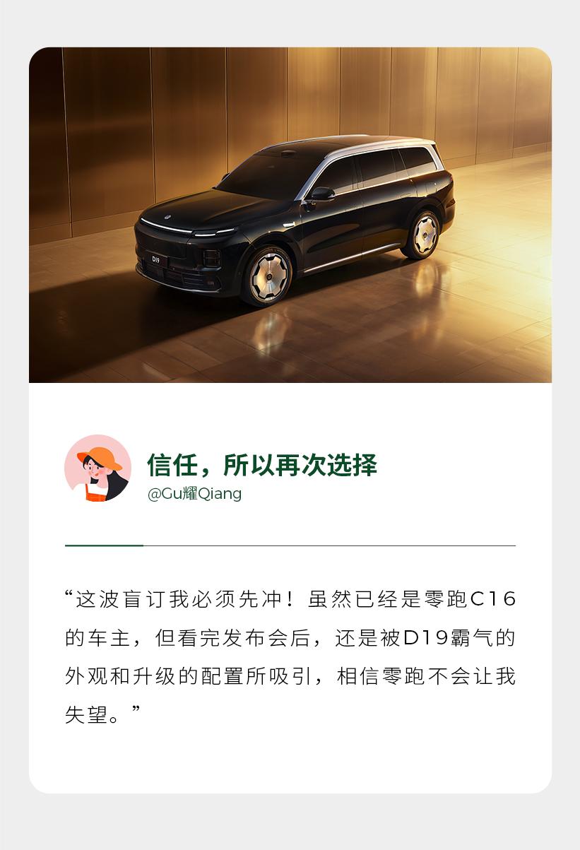 零跑交付量再创新高,D19你订了吗? 凭借11月70327台的交付量,零跑月交付再破7万台,连续9个月拿下新势力单一品牌月销冠军。而除了在售车型销量喜人外,其实零跑最近亮相的新车,比如D19的盲订数据也是非常不错。 零跑D19之所以盲订喜人,离不开越级的产品力,30万的价格就有百万级豪车的体验。80.3kWh的全球最大混动电池,带来500km纯电续航;800V高压增程系统,让SOC 30%至80%仅需15min,妥妥全球纯电续航最长的增程车型。同时,纯电版也全球首发115kWh宁德时代超级混合电芯,续航720km。 另外,零跑D19还有双8797舱驾一体芯片和LEAP4.0中央域控,可实现VLA辅助驾驶和端侧大模型超智能座舱;更有贴心的车规级森野氧舱以及带220V插座的超大前备厢。 对于零跑的产品,车主最有发言权,就像这位用户所说,“这波盲订我必须先冲!虽然已经是零跑C16的车主,但看完发布会后,还是被D19霸气的外观和升级的配置所吸引,相信零跑不会让我失望。” 数据和评价是最真实的背书,你就放心下订零跑D19吧!