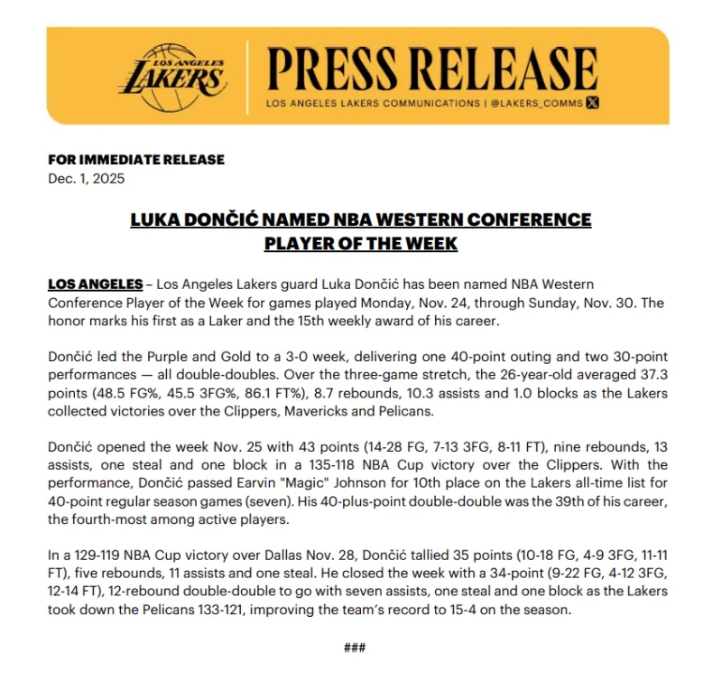 This marks the first time, believe it or not, Luka Doncic has been named Western Conference Player of the Week as a Laker. It's the 15th time in his NBA career.太阳vs湖人东契奇布伦森当选周最佳湖人战力榜升至第4