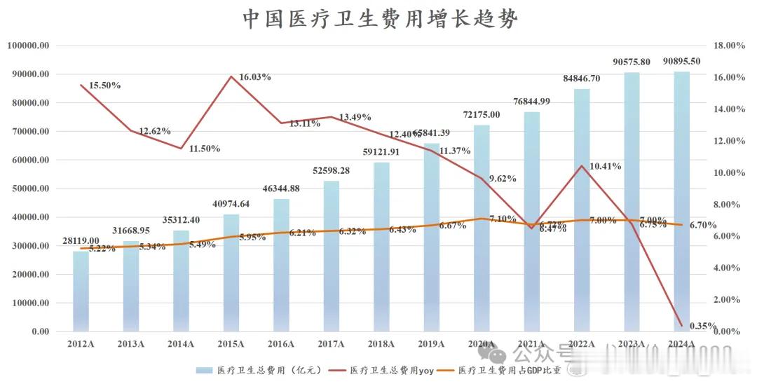 卫健委今天发布了2024年卫生健康事业发展统计公报,分享一些数据:政府卫生支出2.26万亿同比下降6.38%,社会卫生支出4.33万亿同比增长3.85%,个人卫生支出2.50万亿同比增长1.04%。医院数量38710家同比增长0.93%,增速创历史新低;居民总诊疗人次104.5亿次同比增长6.28%,居民平均就诊次数7.2次同比提升0.4次。门诊人均药费133.0元同比下降0.37%,住院人均药费2010.4元同比下降14.76%。2024年中国医疗卫生费用合计为9.09万亿元同比增长0.35%(增速历史新低)。医疗费用占GDP比重为6.7%,同比下降0.3%个百分点。决定医药行业总量的不是老龄化趋势,而是是医保池子/支付能力。所以,这就是医药25年之前长期大熊市的根本原因,而25年之所以能起来,是创新药打开了海外市场。这也意味着那些依靠国内市场的仿制药(甚至是部分创新药以及中药)整体来看未来难有行情,是标准的夕阳行业,器械也是一样的逻辑,一定要有出海对标甚至超越海外巨头的产品线。原文如下:网页链接