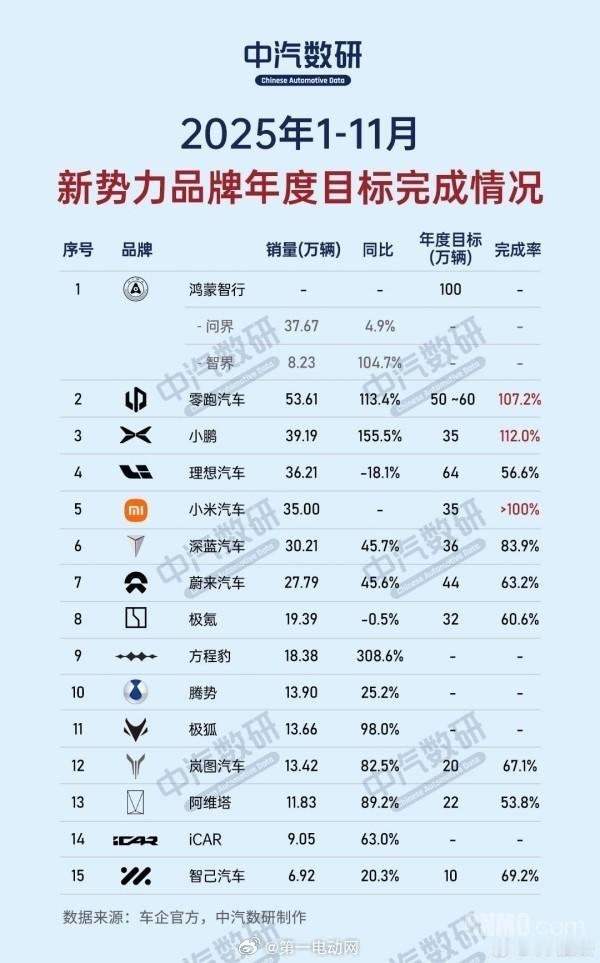 有机构发布的2025年11月新势力品牌销量榜单、2025年1-11月新势力品牌年度目标完成情况榜单11月销量看点鸿蒙智行(问界+智界+尊界+享界+尚界)单月卖了 8.1万多辆,排第一 鸿蒙智行零跑卖了 7万多辆,连续两个月破7万,排第二 零跑汽车小米汽车月销再次超过4万辆,冲到第三 小米汽车曾经的第一梯队“蔚小理”,这个月销量都在3.6万到3.3万辆之间,排第四到第六 年度KPI冲刺结果零跑:累计已超53.6万辆,完成率107.2%,首个撞线小鹏:累计近39.2万辆,完成率112.0%,也提前达成小米:从24年3月到现在已经卖了50万台,今年的交付量已超额完成相比之下,理想和蔚来的年度目标完成率还在60%上下,最后一个月压力不小;而深蓝汽车的年度目标完成率达83.9%,是目前未完成年度目标的新势力品牌中完成率最高 新能源汽车销量