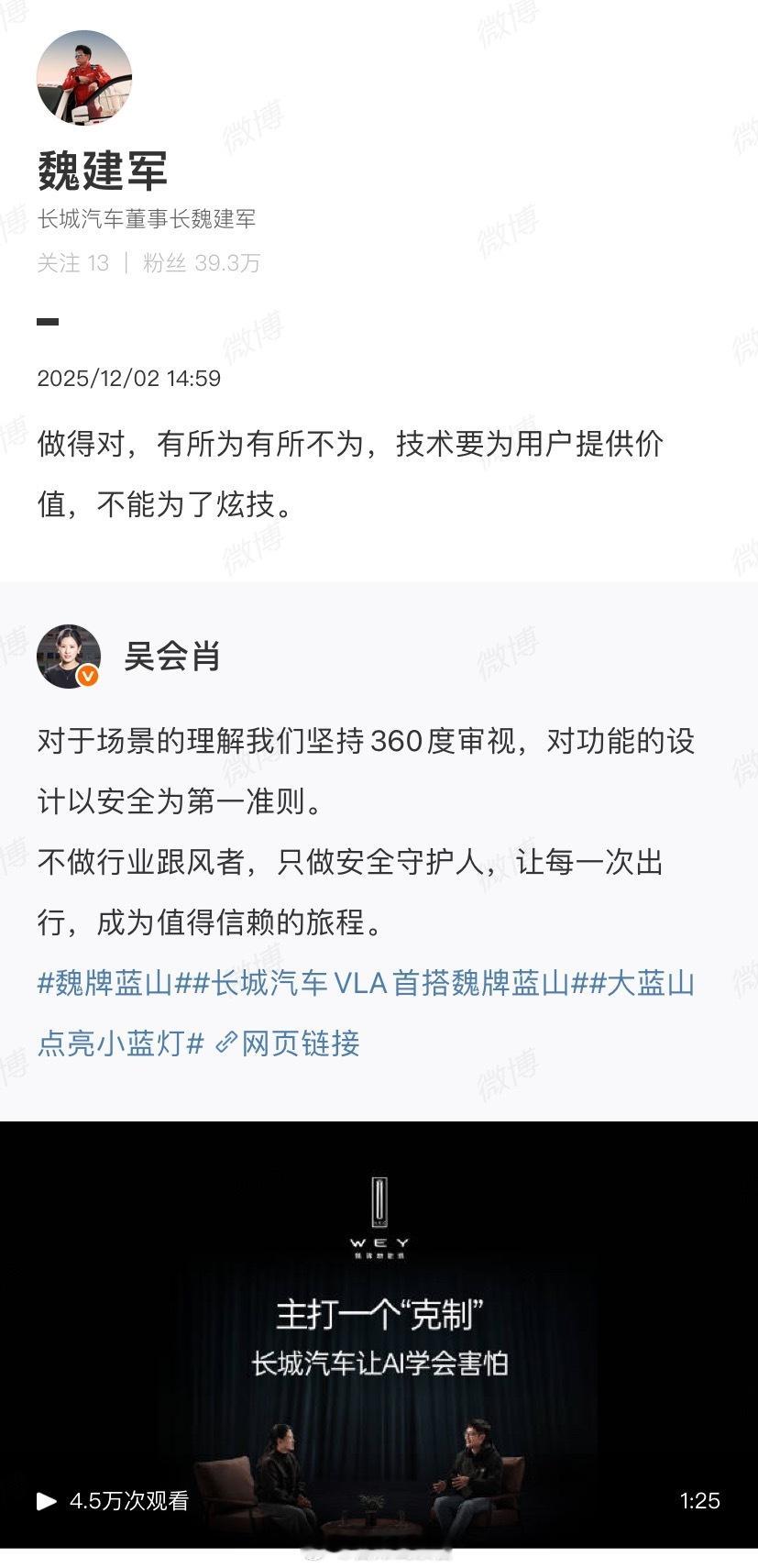 魏建军强调技术应以用户价值为先,而非炫技。长城汽车308_IO新能源汽车