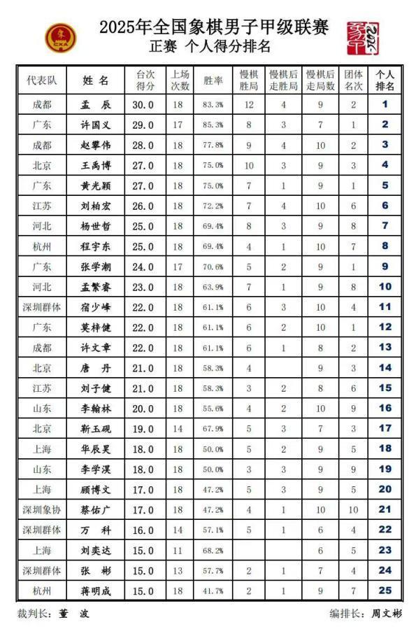 今年象甲联赛中,北京队以老带新,轻装上阵。比赛中,强力新星王禹博表现出色,排名个人第四,显示出色的单打能力。王禹博5岁学棋,2023年开始代表北京队征战象甲联赛。2024年底,在含金量颇高的“天天象棋杯”邀请赛上,他全胜夺冠,成为“00后”棋手中的翘楚。此外,北京队其他几位男将中,靳玉砚发挥抢眼,最终个人排名第十七,而么毅和金波也屡有贡献。