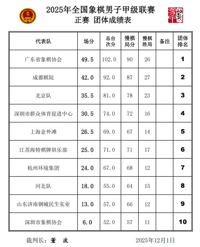 全部18轮比赛结束后,广东队积49.5分获得冠军,成都棋院队积42分获得亚军,北京队积35.5分获得季军。