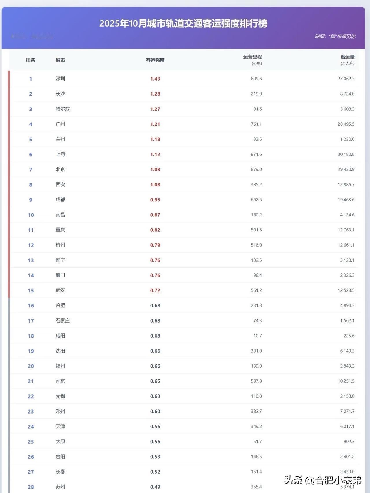 盼了又盼的合肥地铁第四轮规划,至今仍无明确消息,让不少市民心心念念!当前合肥地铁客流强度位居全国第16位,这样的成绩略显尴尬,有网友分析,部分远离市区的线路分流了客流,一定程度上影响了整体强度。 值得期待的是,好消息正在赶来!距离地铁6号线通车仅剩25天,这条新线路将正式落户合肥东部新中心,为区域交通注入新活力。主城区域人口密集、出行需求旺盛,6号线的开通有望进一步激活客流,为合肥地铁客流强度“雪中送炭”。 你认为第四轮地铁规划能顺利获批吗?6号线通车后会给你的出行带来变化吗?欢迎在评论区聊聊你的看法~ 爆料