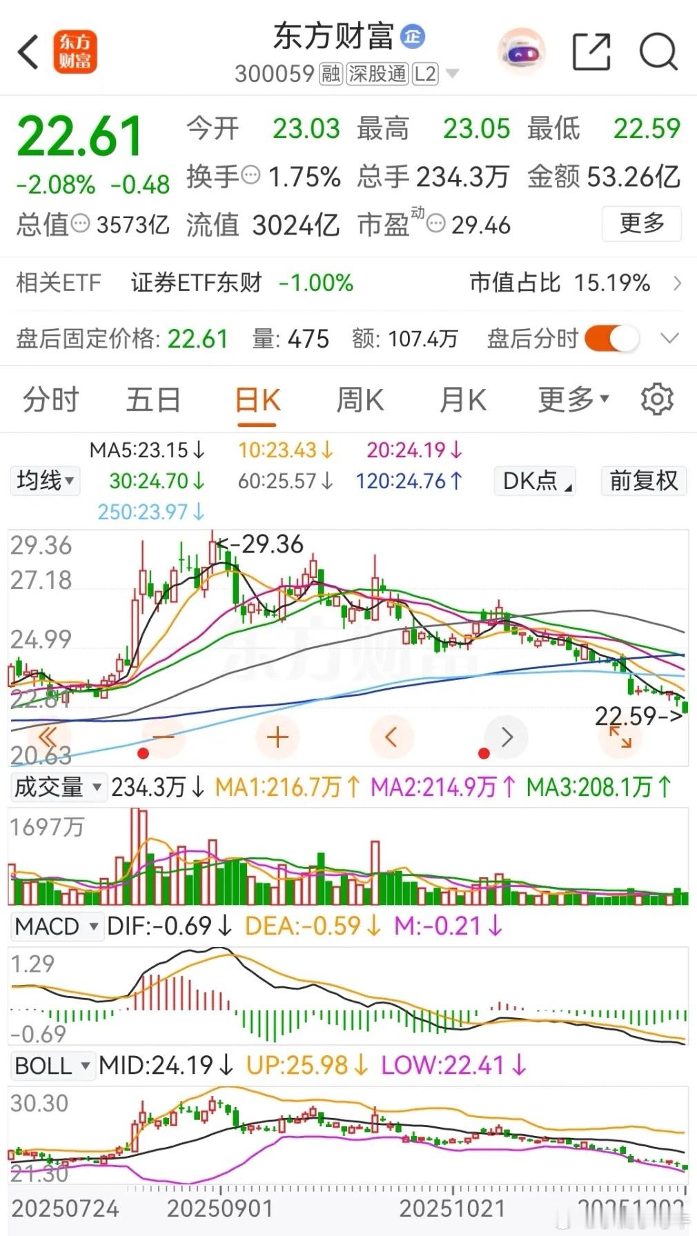 东方财富和中信证券今天低开低走,分别下跌了2.08%和1.08%,其中东方财富更