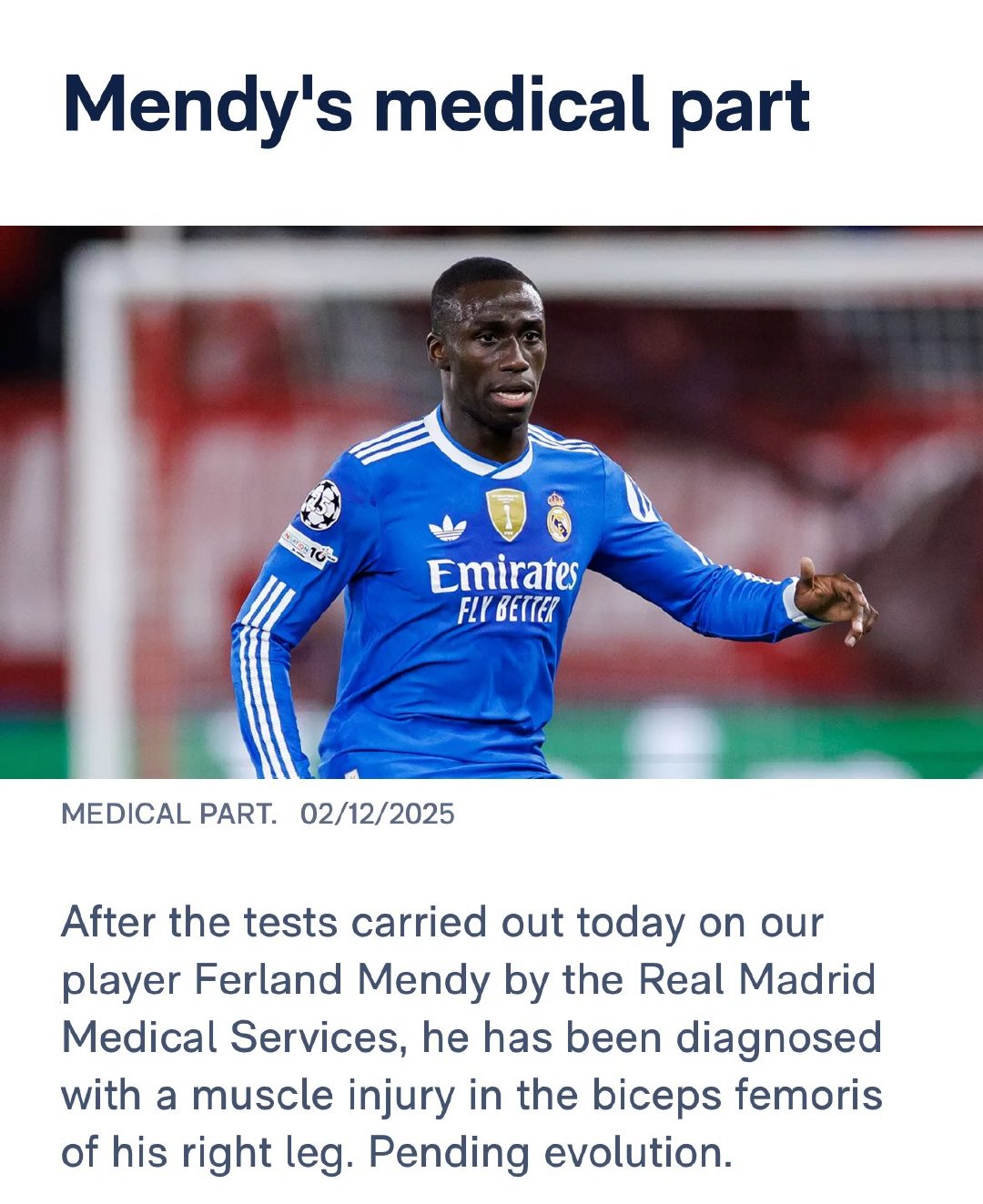 Arancha Rodríguez:门迪右腿股二头肌受伤后告别了2025年,他将于2026年回归。halamadrid
