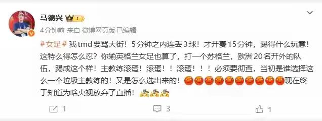 女足5分钟丢3球,2:3负世界排名第25的苏格兰女足,马德兴骂大街信息量挺多:直戳主帅安特·米利西奇,要求彻查怎么选这澳大利亚人来带女足,明白央视为什么不再转播女足。 老马虽然是粗口,但话粗理不粗,米利西奇带女足一年半,成绩却跳水式滑坡,特别是此前0:8惨负英格兰“追平”历史,显然教练是主要因素。现在离亚洲杯小组赛还有近100天,换教练是否来得及?足协能下决心么?
