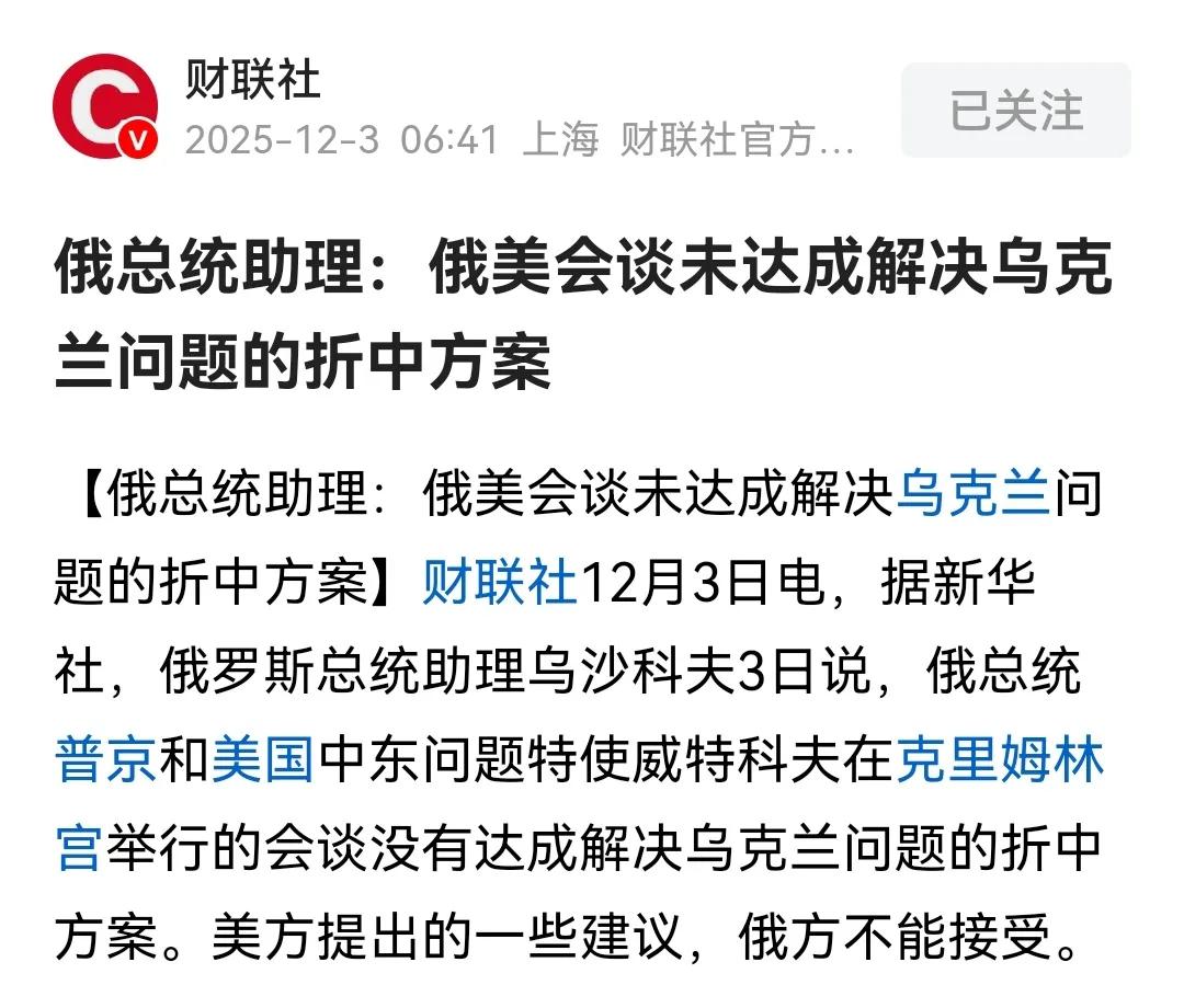 俄乌停火谈判又回到原点。 先是俄罗斯认可的“28点和平计划”遭乌克兰与欧洲的拒绝,接着推出乌克兰愿意接受的修改版“19点和平计划”,如今却被俄罗斯否决了。 特朗普为调停俄乌停火都忙了差不多一年,现在又绕回原来的地方,不知道他接下来还有什么别的高招? 没办法,涉及领土问题,双方互不相让,谈不下去,唯有继续打下去。
