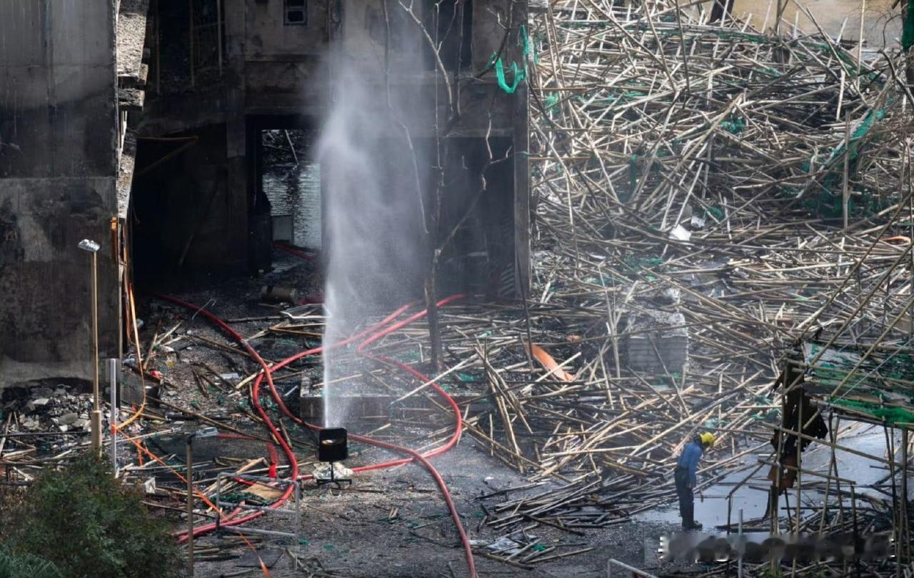 一名消防员向同袍何伟豪殉职的位置鞠躬。