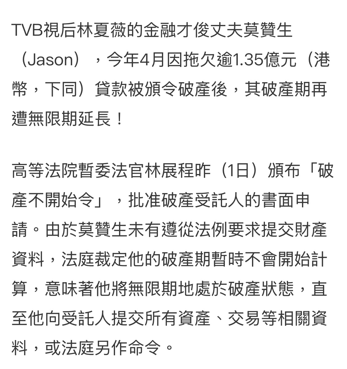 林夏薇这是真被骗了?林夏薇的老公欠1.35亿港币,因为他没有在破产令后提交财产资料,所以林夏薇老公现在将无限期处于破产状态。