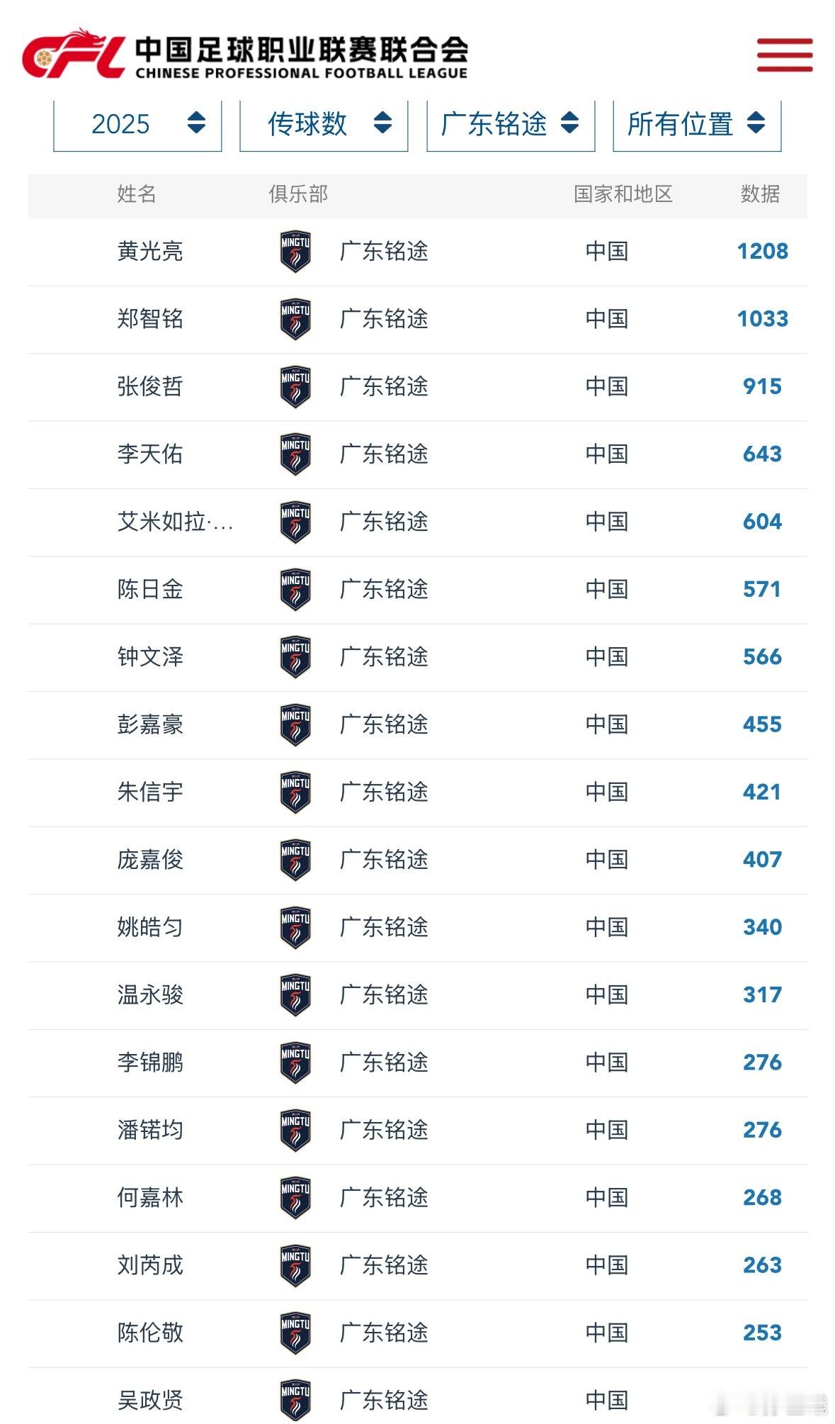 2025广东铭途第一个职业赛季,队内最佳射手何嘉林8球(24球联赛最佳),队内助攻王刘子恒3球助攻(9球联赛最佳),队内传球手黄光亮1208脚传球(1670联赛最多).