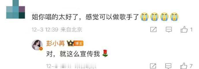 彭小苒 对就这么宣传我 彭小苒生日单曲《把故事还给昨天》好嗑又好哭!轻柔的嗓音唱情歌,娓娓道来的感觉直接脑补甜虐情节,粉丝夸她能做歌手,她的臭屁回应太圈粉了! 剧综大咖开放麦