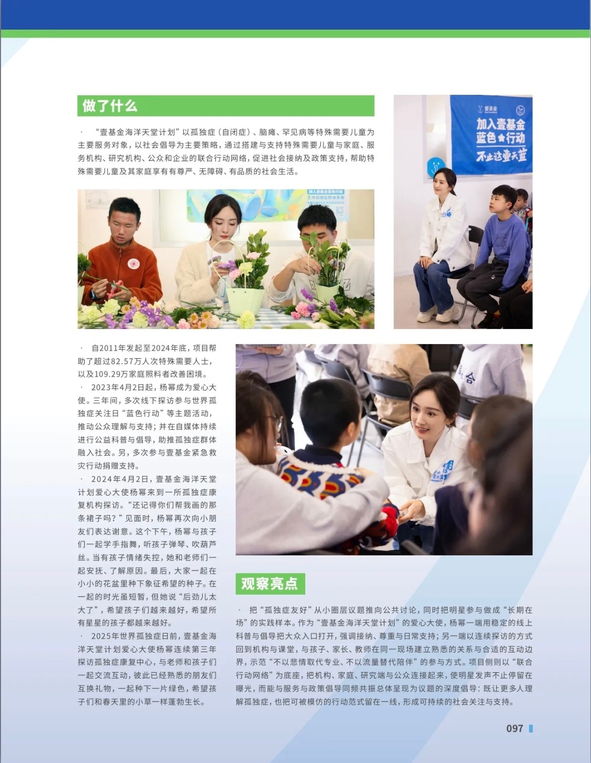 中国乡村发展基金、中国电影基金会、《大众电影》杂志社共同发起【2024-2025演艺明星公益观察与案例】报告,其中参与的“壹基金海洋天堂计划”入选明星公益年度案例!该计划以孤独症(自闭症)、脑瘫、罕见病等特殊需要儿童为主要服务对象。作为“壹基金海洋天堂计划”的爱心大使,杨幂一端用稳定的线上科普与倡导把大众入口打开,强调接纳、尊重与日常支持;另一端以连续探访的方式回到机构与课堂,与孩子、家长、教师在同一现场建立熟悉的关系与合适的互动边界,示范“不以悲情取代专业、不以流量替代陪伴”的参与方式!