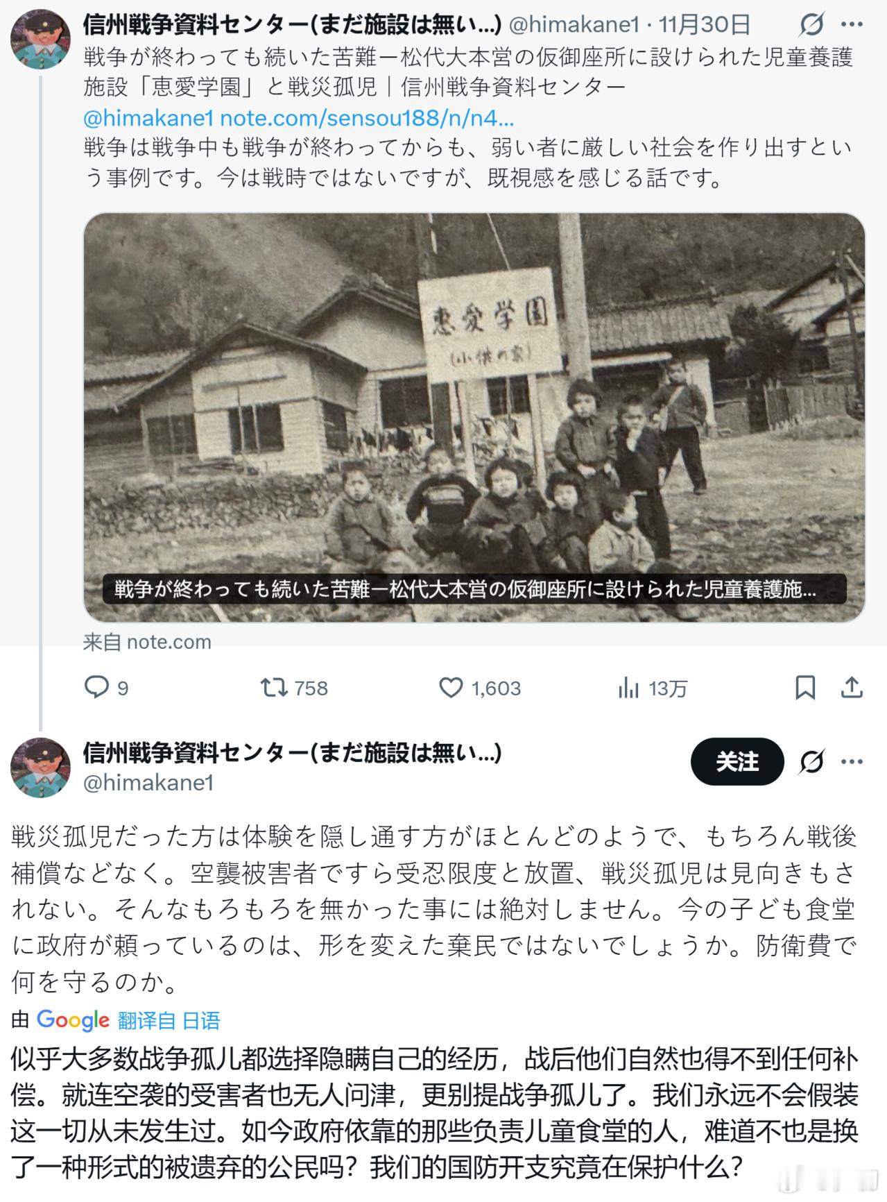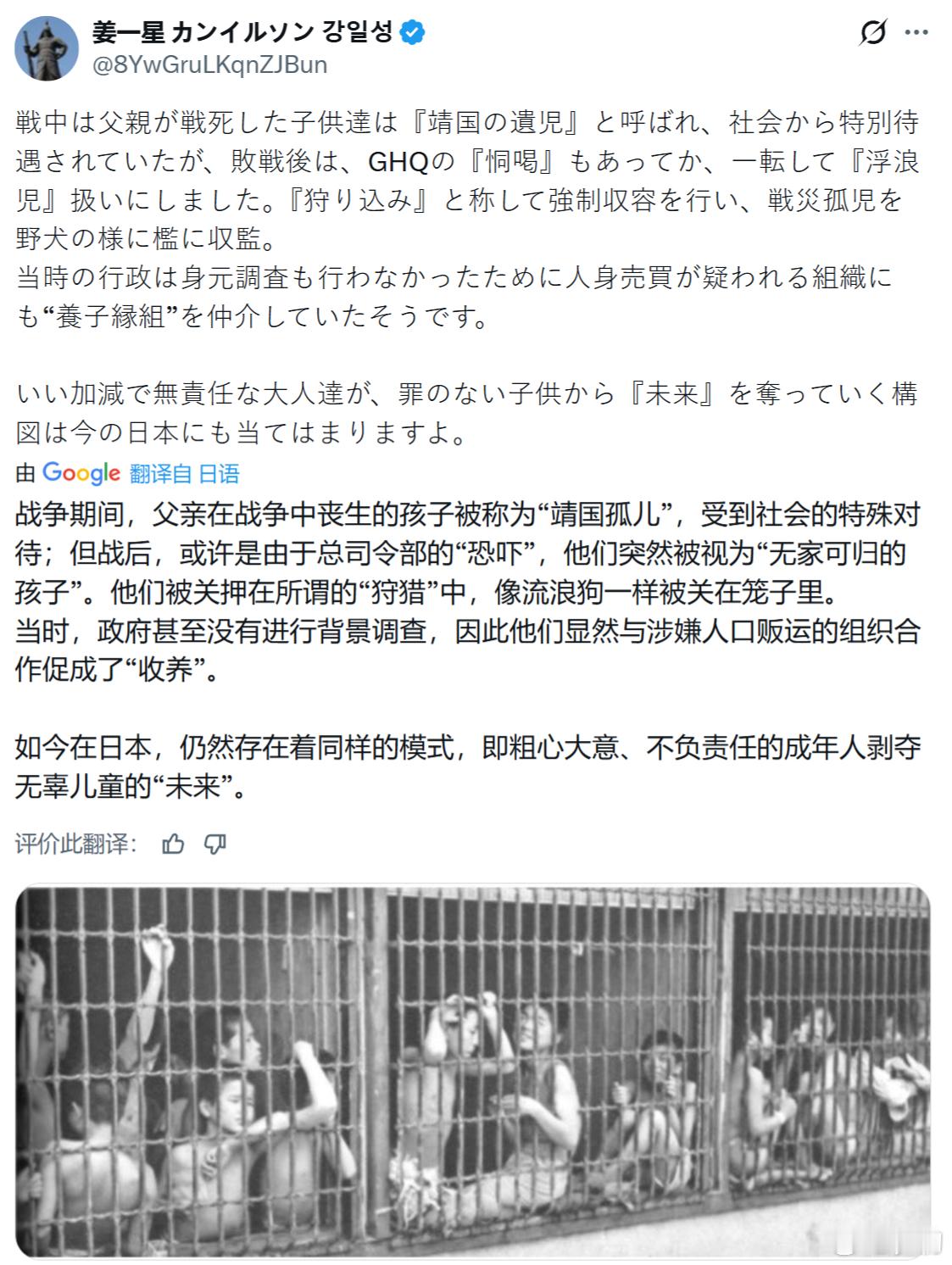 日本是这样对待战后遗孤的:战争期间,父亲在战争中丧生的孩子被称为“靖国孤儿”,受到社会的特殊对待;但战后,或许是由于总司令部的“恐吓”,他们被视为“无家可归的孩子”。流落街头的战争孤儿被强制收容,即所谓的“唐込”,并被送往机构。然而,这种“唐込”制度的背后是社会普遍认为战争孤儿会构成安全隐患。他们被关押在所谓的“狩猎”中,像流浪狗一样被关在笼子里。事实上,战争孤儿为了生存,不得不从事偷窃等犯罪活动。当时,政府甚至没有进行背景调查,因此他们显然与涉嫌人口贩运的组织合作促成了“收养”。如今在日本,仍然存在着同样的模式,即粗心大意、不负责任的成年人剥夺无辜儿童的“未来”。-姜一星 カンイルソン 강일성。再看看中国人是怎么对待日本遗弃在中国的战争遗孤的?民族的善恶一目了然。中国人还是太善良了,对一个“畏威而不怀德”民族的宽容大度,换来的恰恰是恩将仇报狼子野心。中日战争不是开玩笑