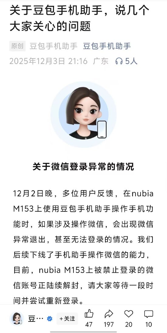 官方表示,12月2日晚,多位用户反馈,在nubiaM153上使用豆包手机助手操作手机功能时,如果涉及操作微信,会出现微信异常退出,甚至无法登录的情况。我们后续下线了手机助手操作微信的能力,目前,nubiaM153上被禁止登录的微信账号正陆续解封,请大家等待一段时间并尝试重新登录。