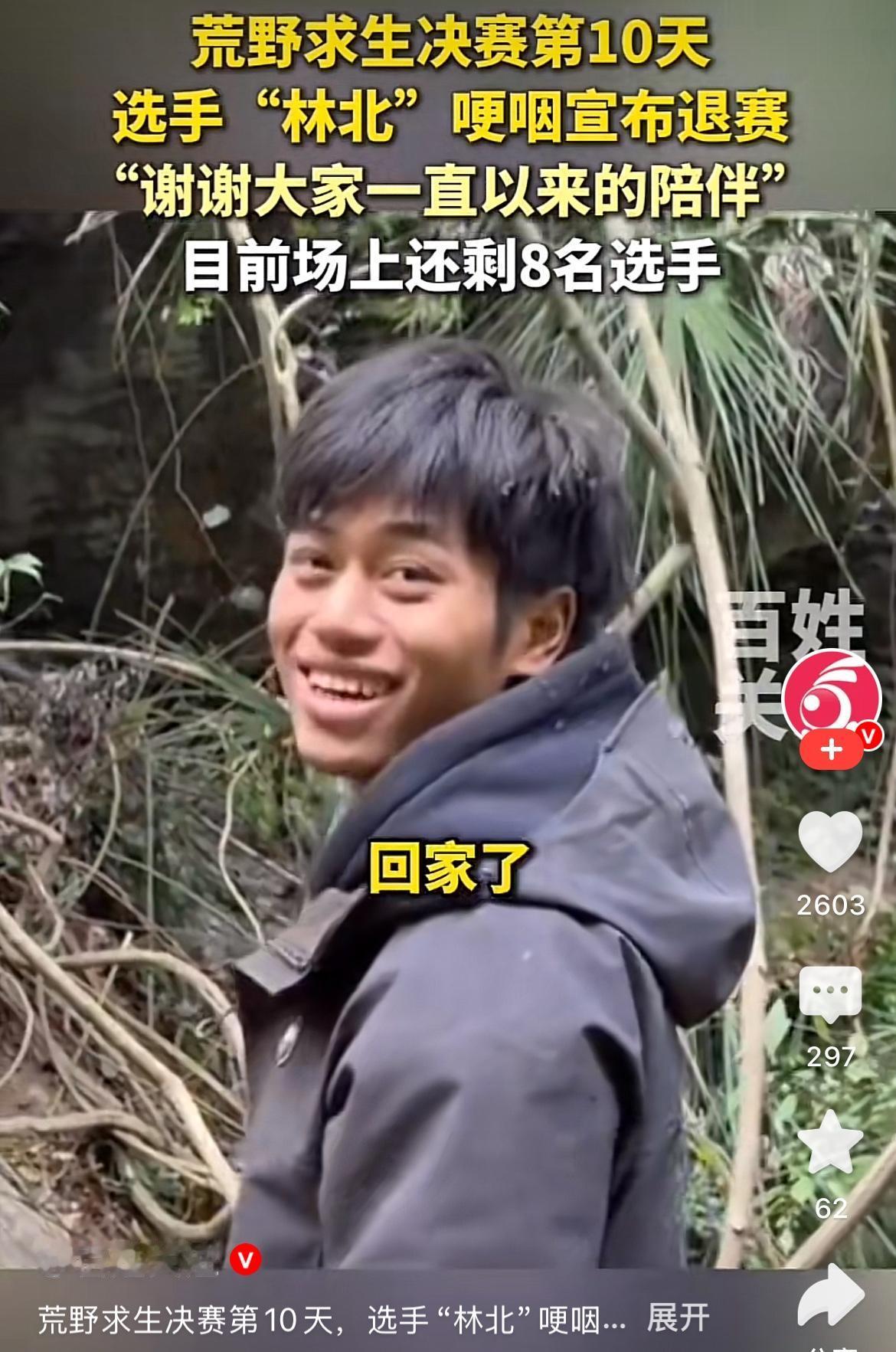 我想过林北会为了冠军全力以赴, 也想过林北会为了决赛坚持到底, 万万没有想到,他会选择在决赛第10天的时候宣布退出比赛! 林北虽然是一个大学生,但是他给人的感觉真的是一个特别的有智慧,聪明有想法的人。 在这次的荒野求生比赛中,所有人都以为他会是这次的冠军时,他突然选择退赛。 而且还伤感的哭了起来,跟工作人员告别。原来他一直都在努力的把最好的一面展现给大家! 现在看来,他是真的累了吧,想要放松一下自己,过会正常人的生活吧!